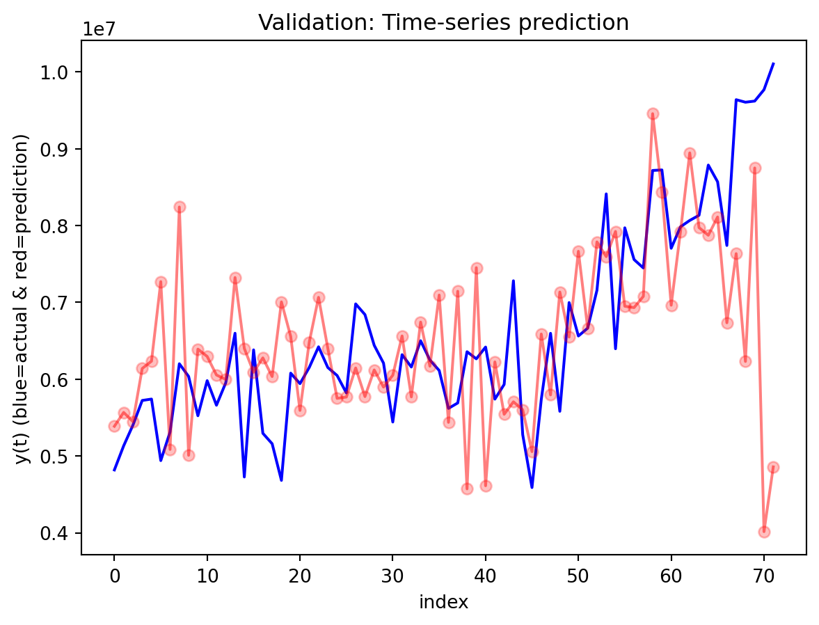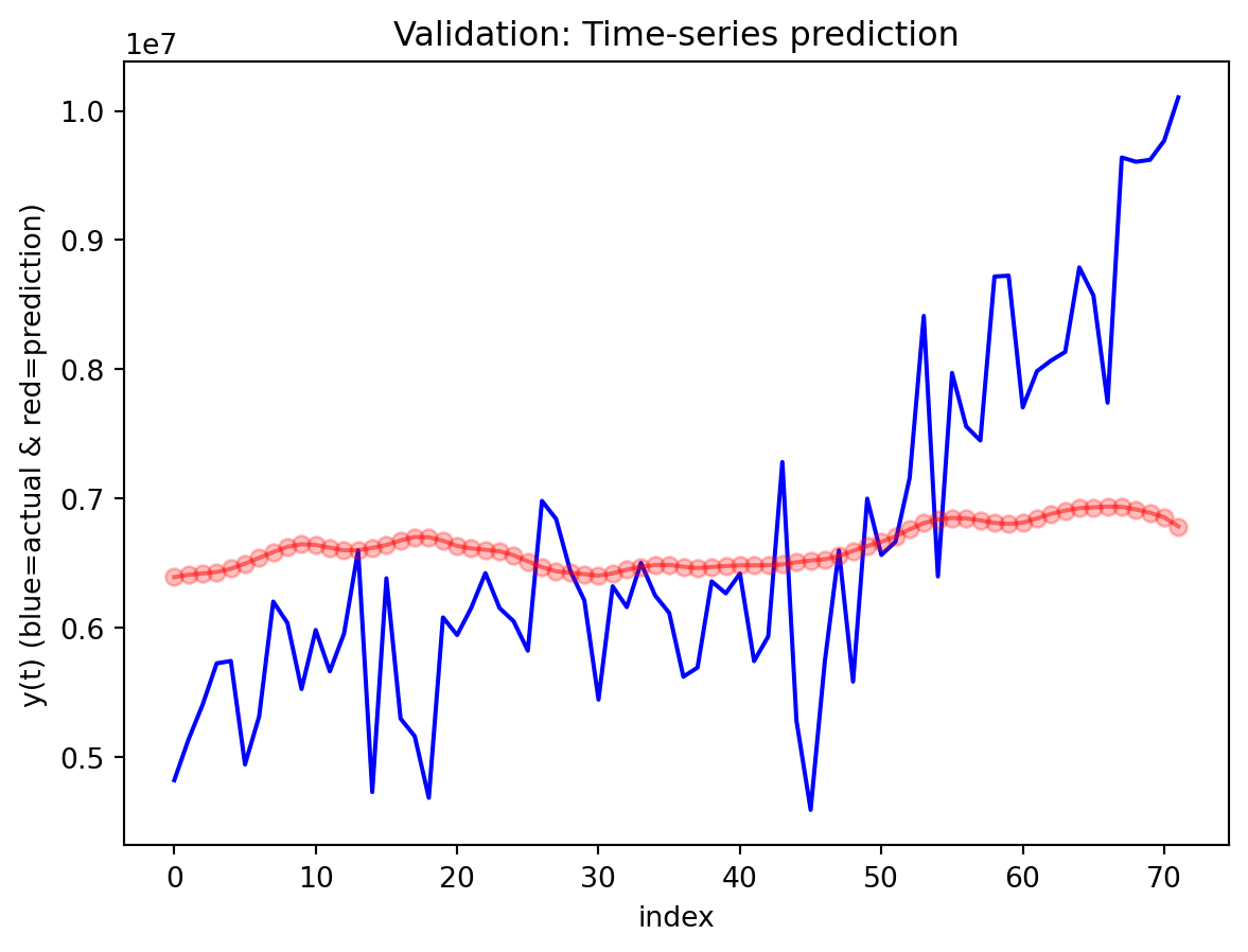 Effectiveness of regularization All three multivariate models share the same regularization,dropout on the recurrent stacks, early stopping on validation loss, and adaptive learning-rate reduction—and this setup performed well on preventing catastrophic overfitting even for the relatively large GRU and LSTM. Training and validation losses stay reasonably close to each other, and early stopping consistently triggers before the maximum epoch budget is used, which suggests that the models are not simply memorizing the training portion of the export series. Still, the gap in performance between GRU, LSTM, and especially RNN shows that regularization alone cannot rescue a poorly matched architecture: the RNN remains underpowered for the multivariate dynamics, and the LSTM appears somewhat over-parameterized. Concluding, regularization stabilizes learning and improves generalization somewhat, but choosing an appropriate architecture (here, the GRU) matters more than further tuning dropout or patience settings.