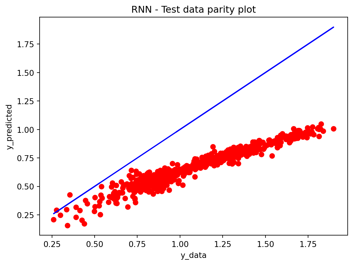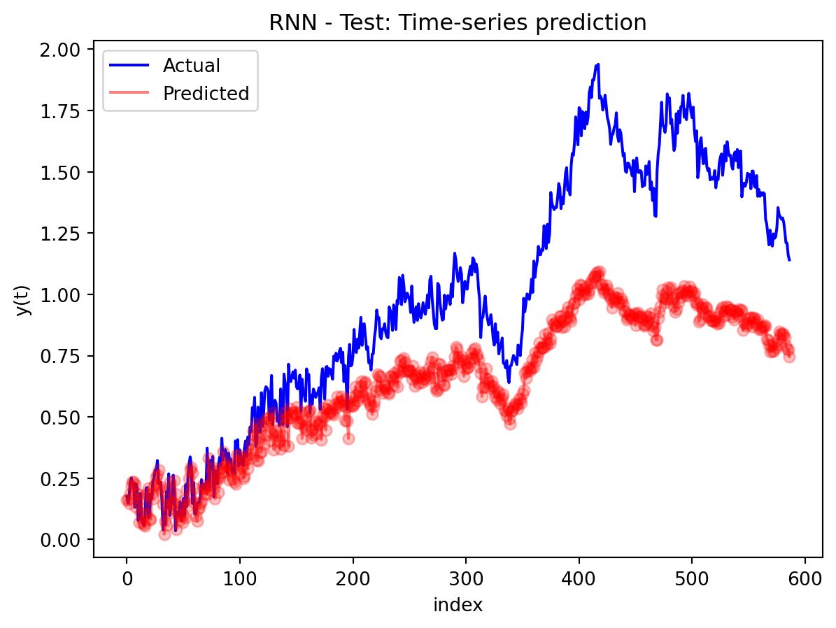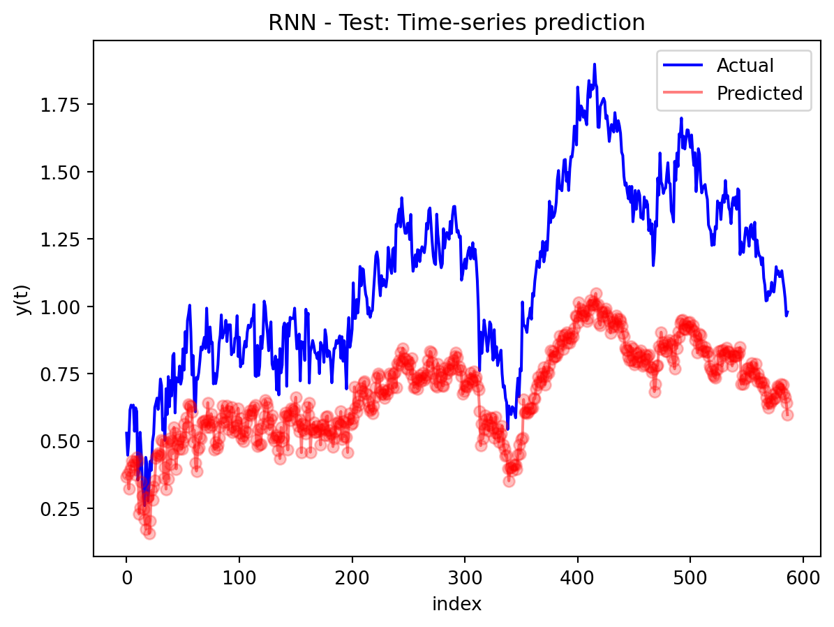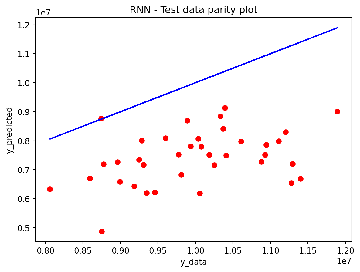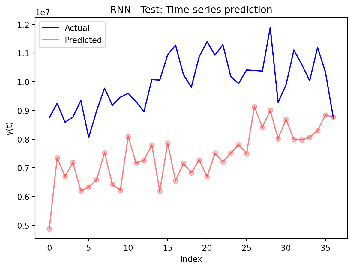 LOOKBACK =30results_exports_rnn = train_single_model(df4, 'RNN', 'South korea Exports to USA(thousand dollars)', LOOKBACK)