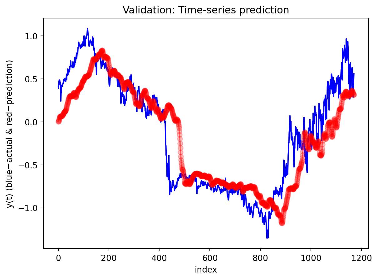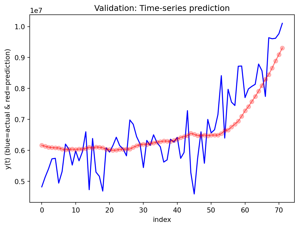For the exports example, the best model forward is to produce a 12-month forecast, which reveals how these networks behave as the horizon extends. The GRU’s forecast starts near the last observed value and then follows a smooth, almost monotonic upward path, with an empirically based 95% confidence band that gradually widens the further you move from the forecast origin. Over the first few steps, the model’s predictions look quite plausible as short-term continuations of the recent trend, but as you approach the end of the year-ahead window, the forecasts become increasingly dominated by an extrapolated trend rather than detailed seasonal or cyclical structure—local fluctuations that appear in the historical data are largely smoothed away. This pattern suggests that the multivariate GRU is most reliable for short-to-medium horizons (a few months ahead), where it is still anchored by recent observations; deeper into the 12-month horizon, its output is better interpreted as a trend scenario with quantified uncertainty than as a precise monthly prediction.