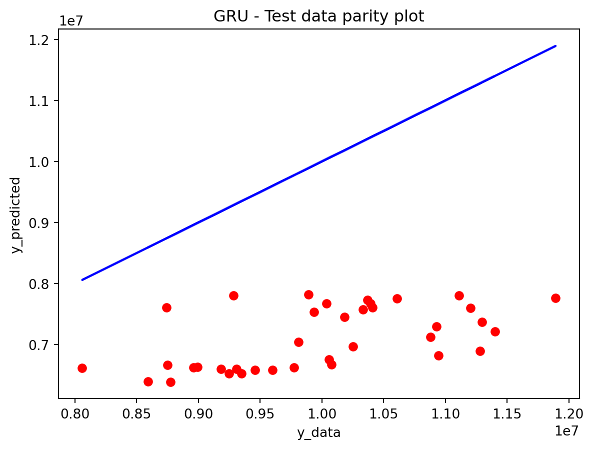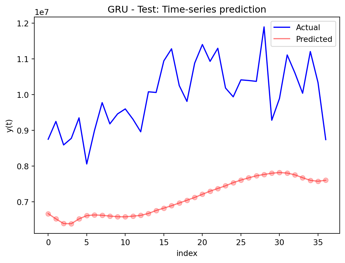 results_exports_gru = train_single_model(df4, 'GRU', 'South Korea export to USA(thousand dollars)', LOOKBACK)