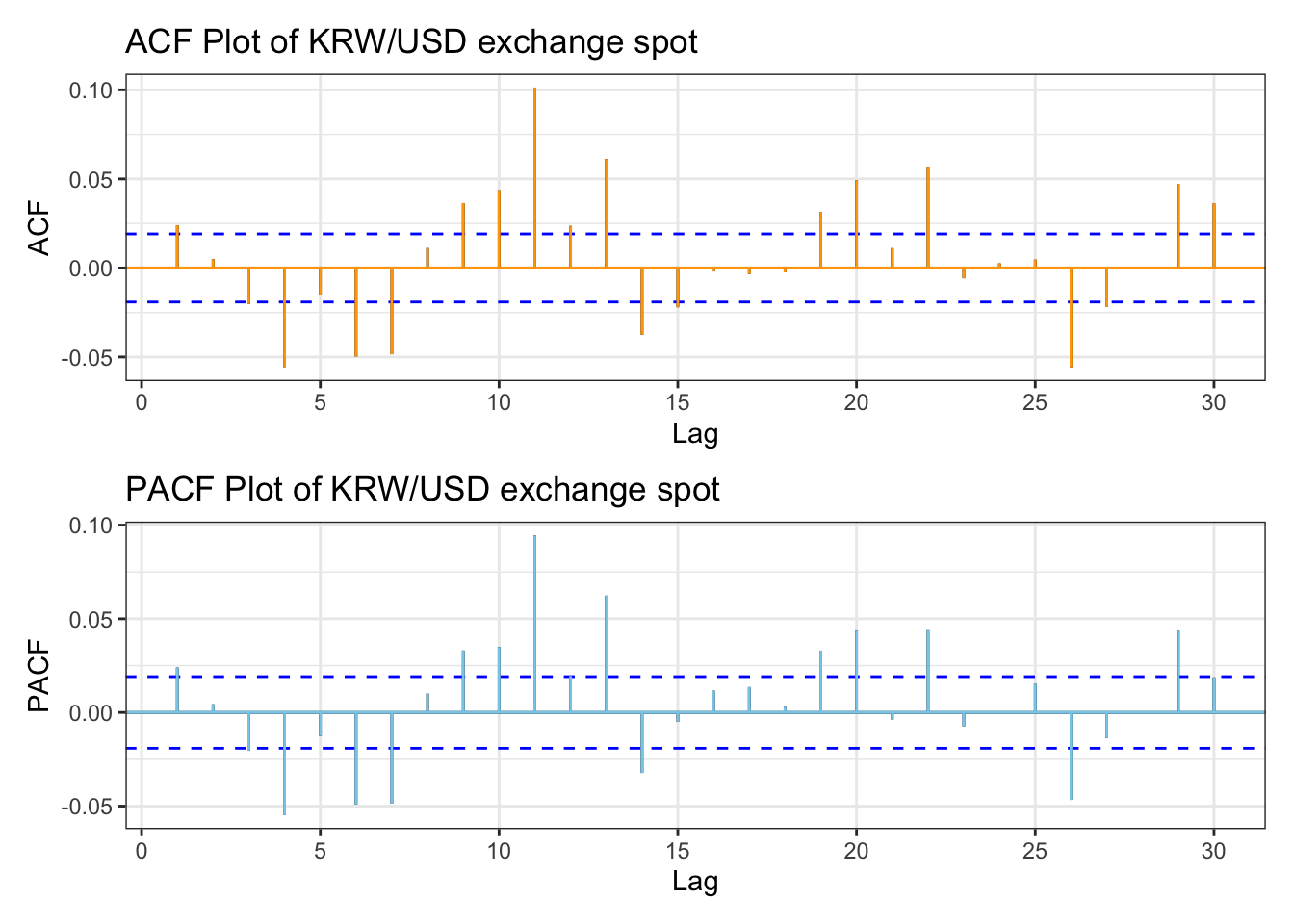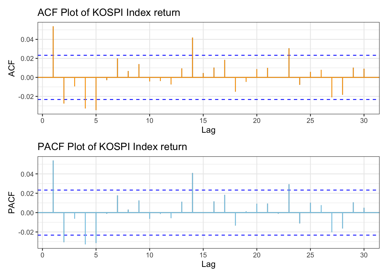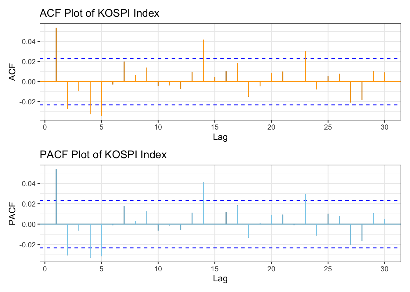library(patchwork)kospi_acf <-ggAcf(kospi_return,lag.max =30)+ggtitle("ACF Plot of KOSPI Index") +theme_bw() +geom_segment(lineend ="butt", color ="orange") +geom_hline(yintercept =0, color ="orange") kospi_pacf <-ggPacf(kospi_return,lag.max =30)+ggtitle("PACF Plot of KOSPI Index") +theme_bw()+geom_segment(lineend ="butt", color ="skyblue") +geom_hline(yintercept =0, color ="skyblue") kospi_acf/kospi_pacf