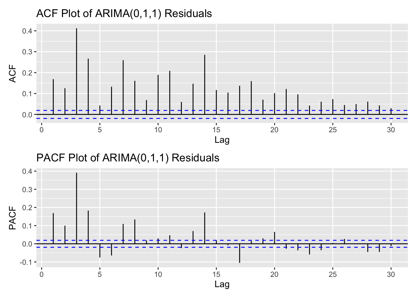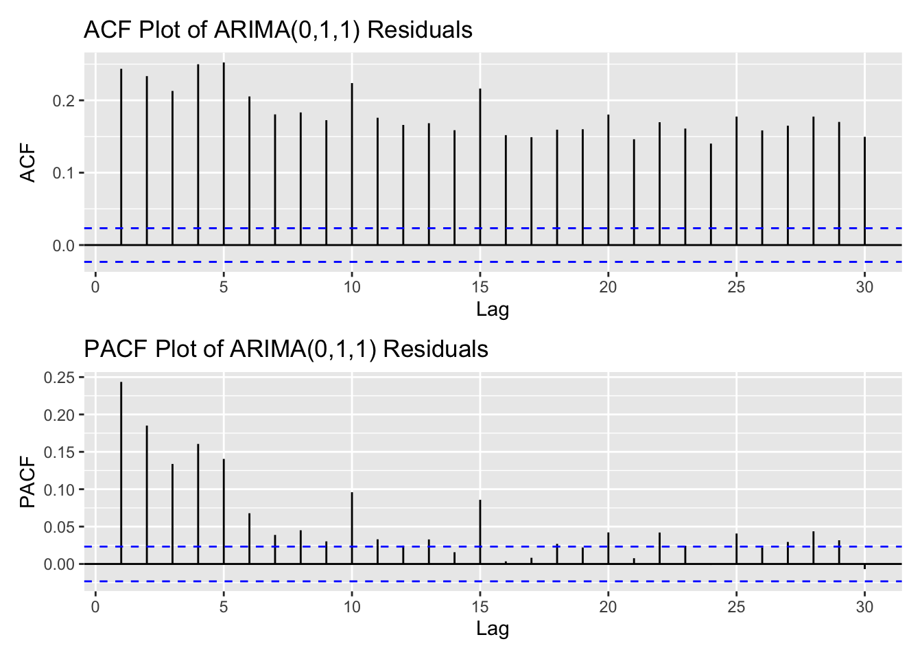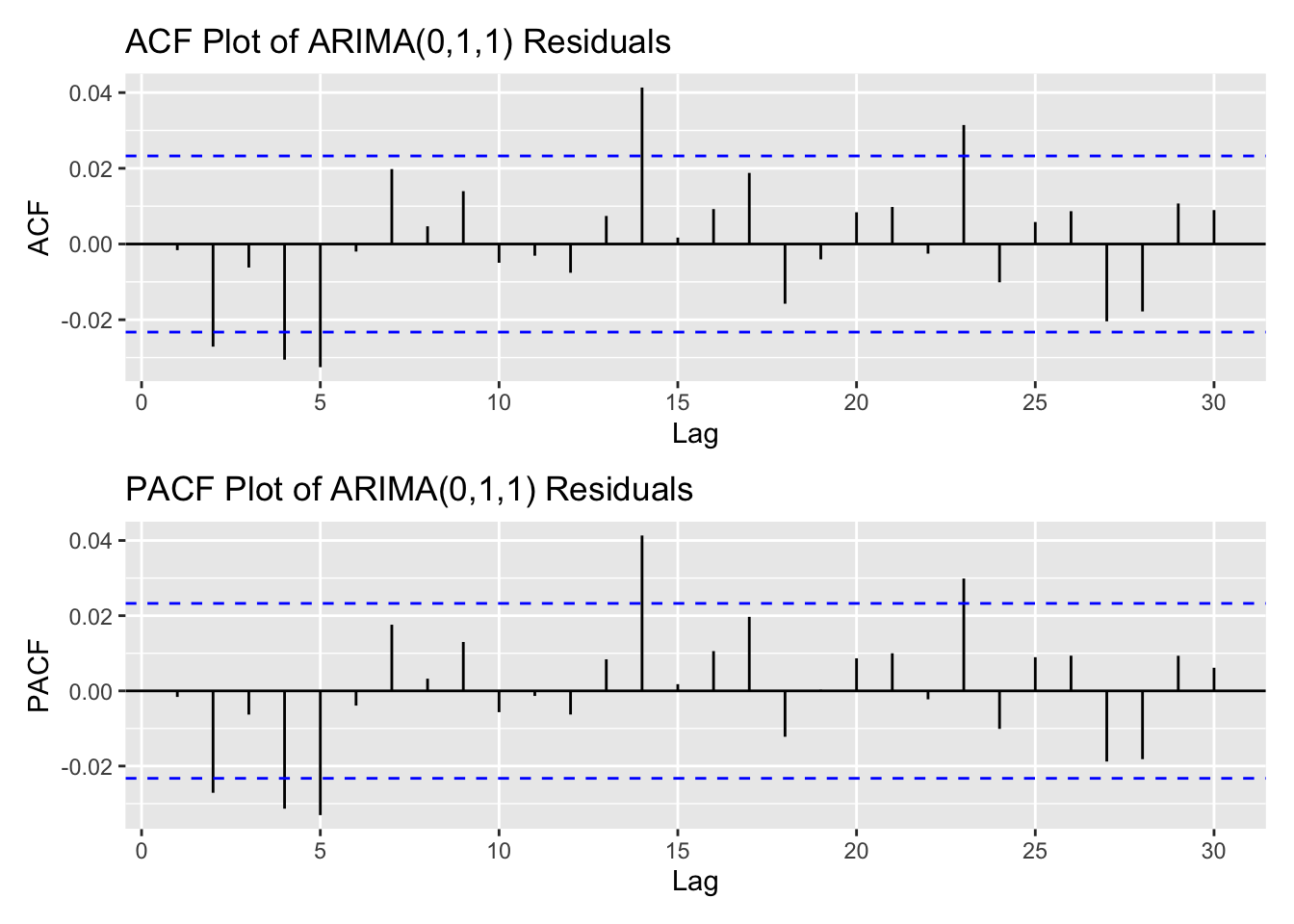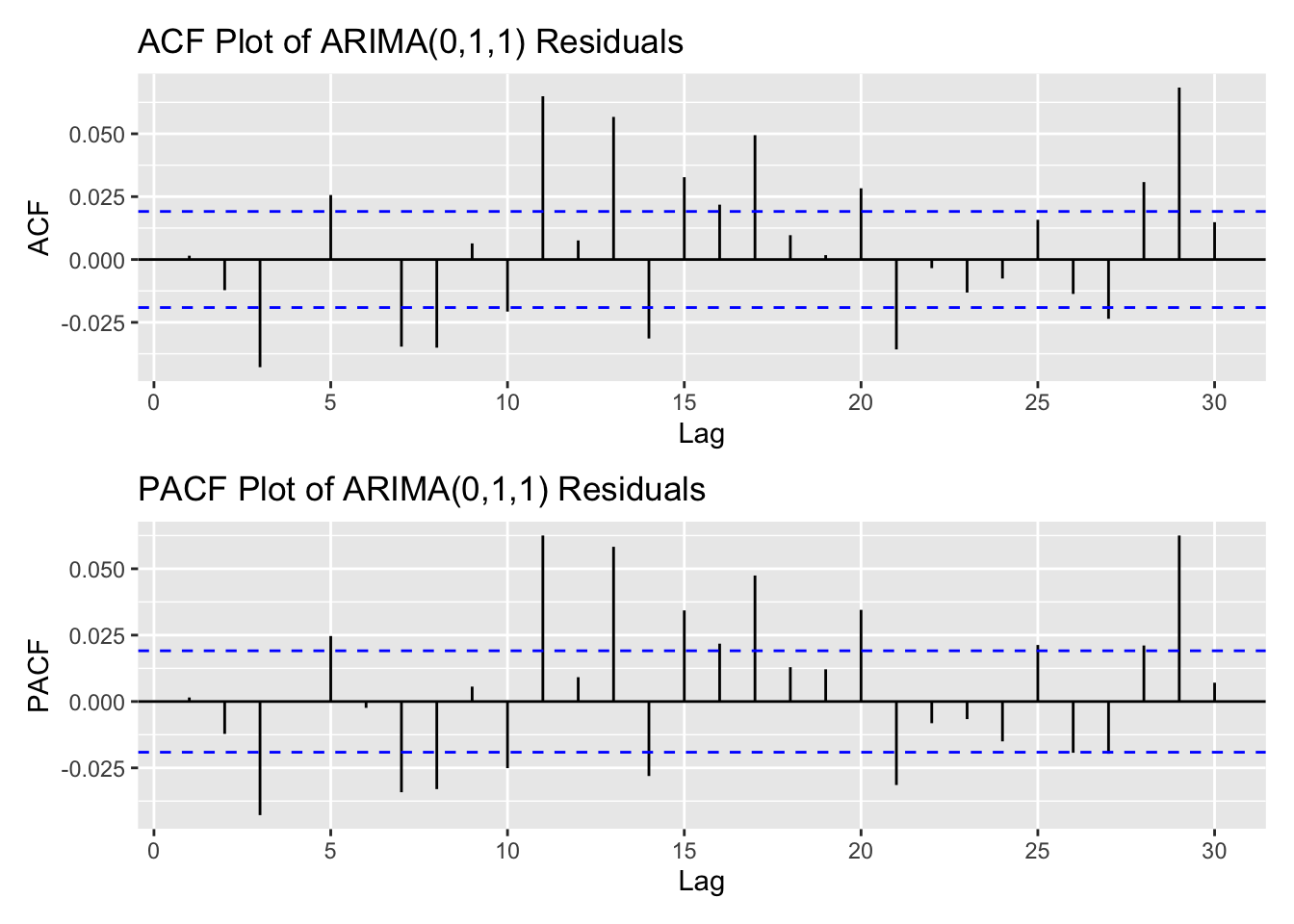 arima_fit1 <-Arima(log(kospi_ts), order =c(0,1,1), include.drift =TRUE)res_arima1<-residuals(arima_fit1)kospi_res_acf <-ggAcf(res_arima1,lag.max =30)+ggtitle("ACF Plot of ARIMA(0,1,1) Residuals") kospi_res_pacf <-ggPacf(res_arima1,lag.max =30)+ggtitle("PACF Plot of ARIMA(0,1,1) Residuals") kospi_res_acf/kospi_res_pacf