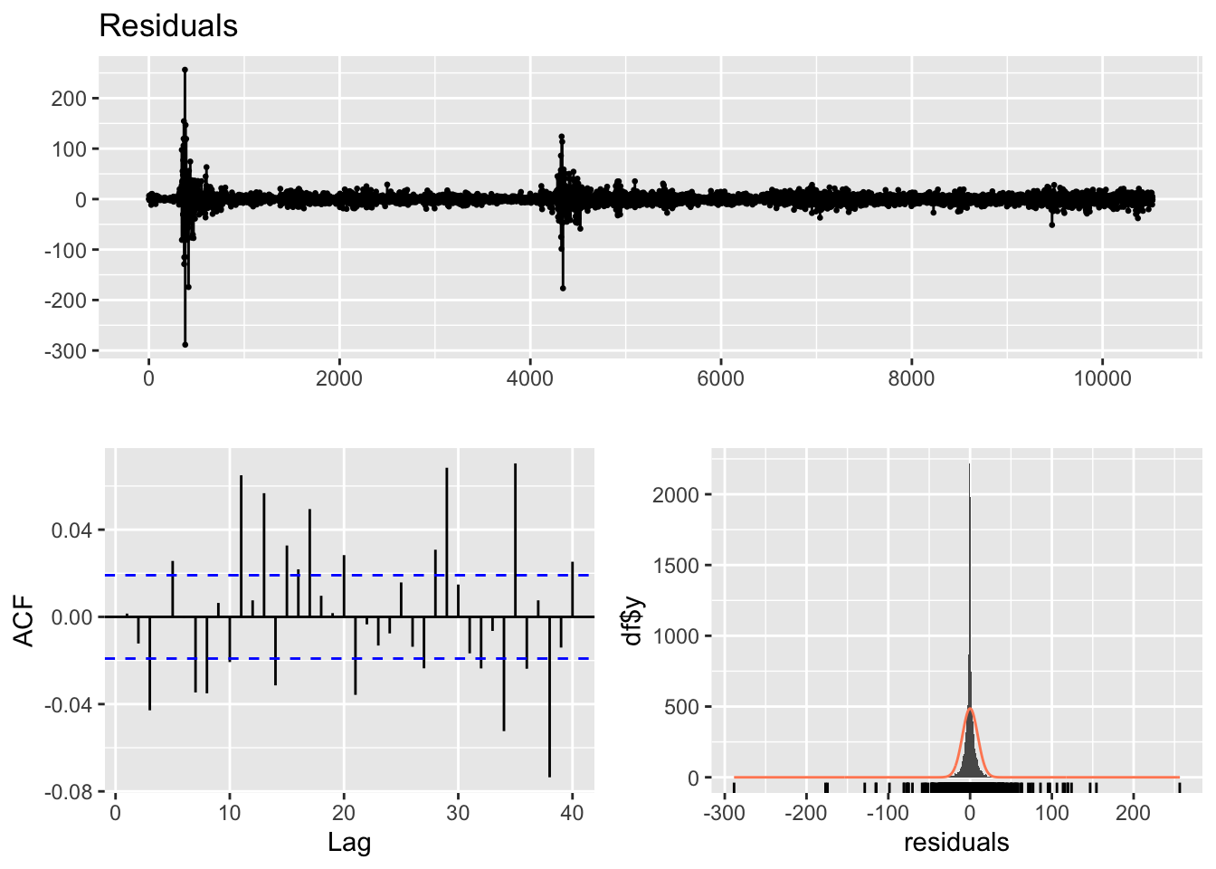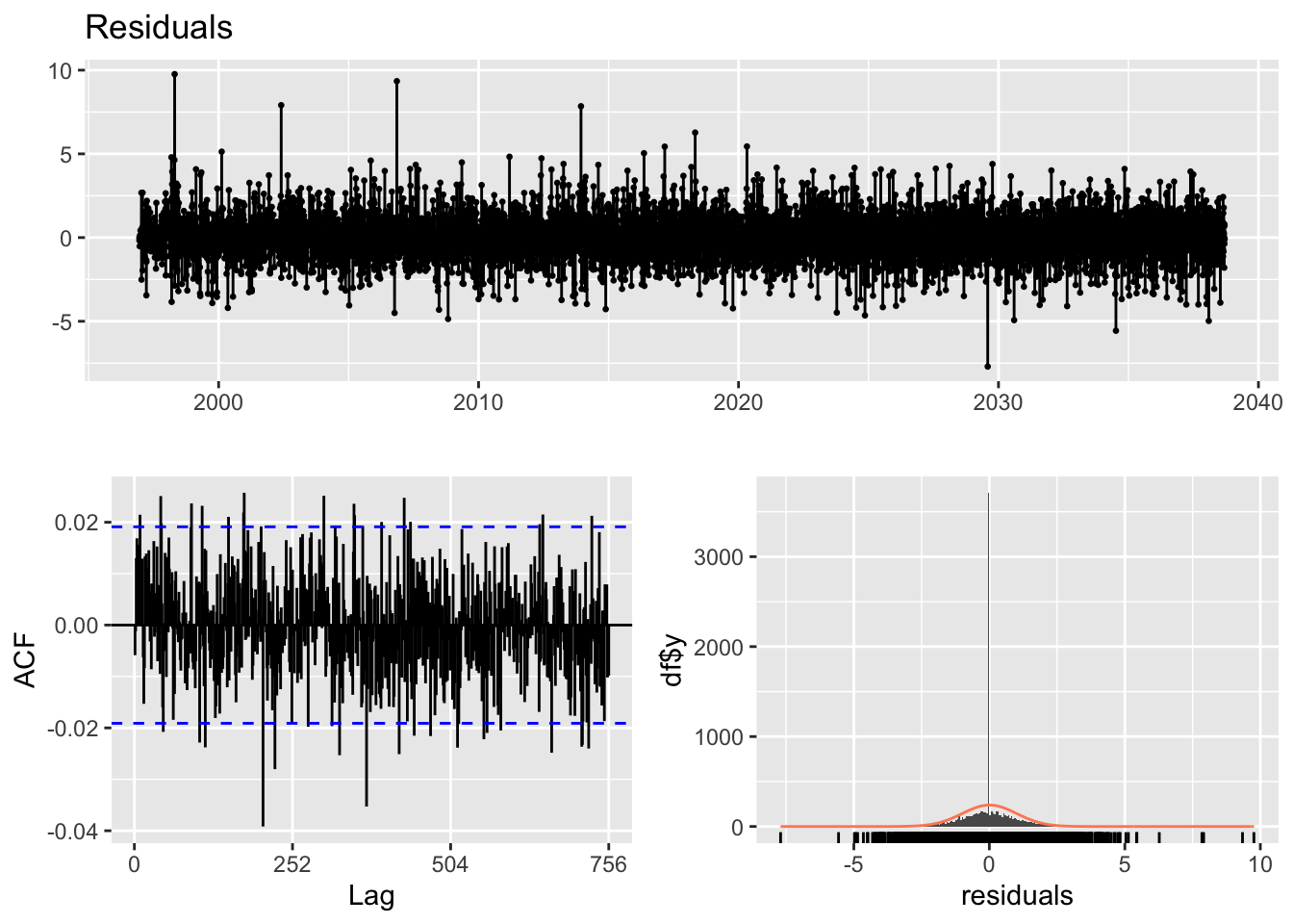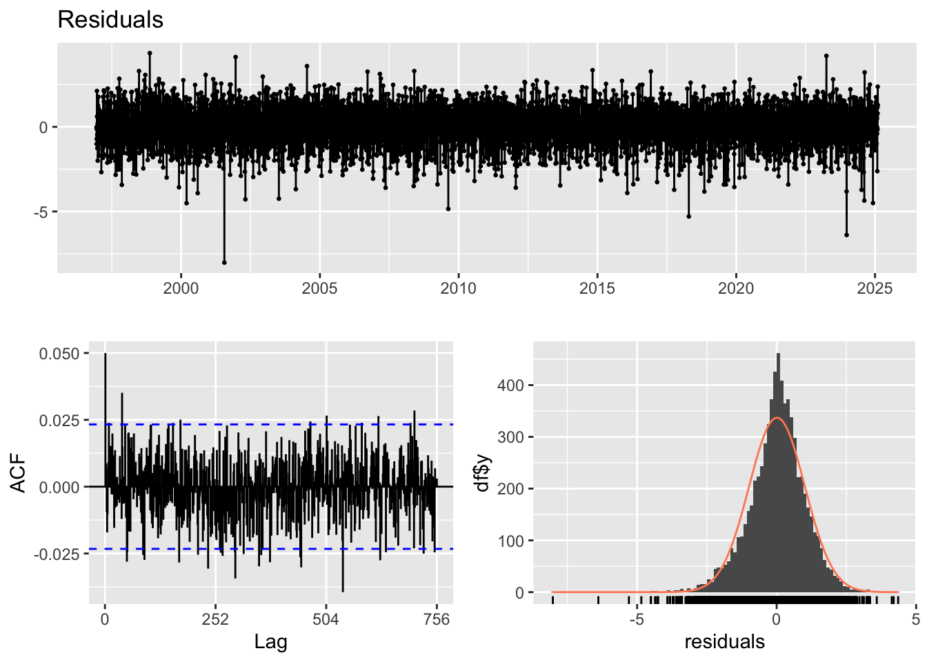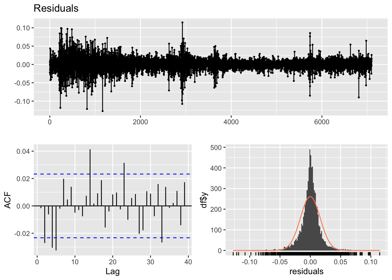 arima_fit2 <-Arima(kr_ts, order =c(4,1,4), include.drift =TRUE)arima_res2<-residuals(arima_fit2)final.fit20<-garchFit(~garch(1, 1), data = arima_res2, trace =FALSE)summary(final.fit20)