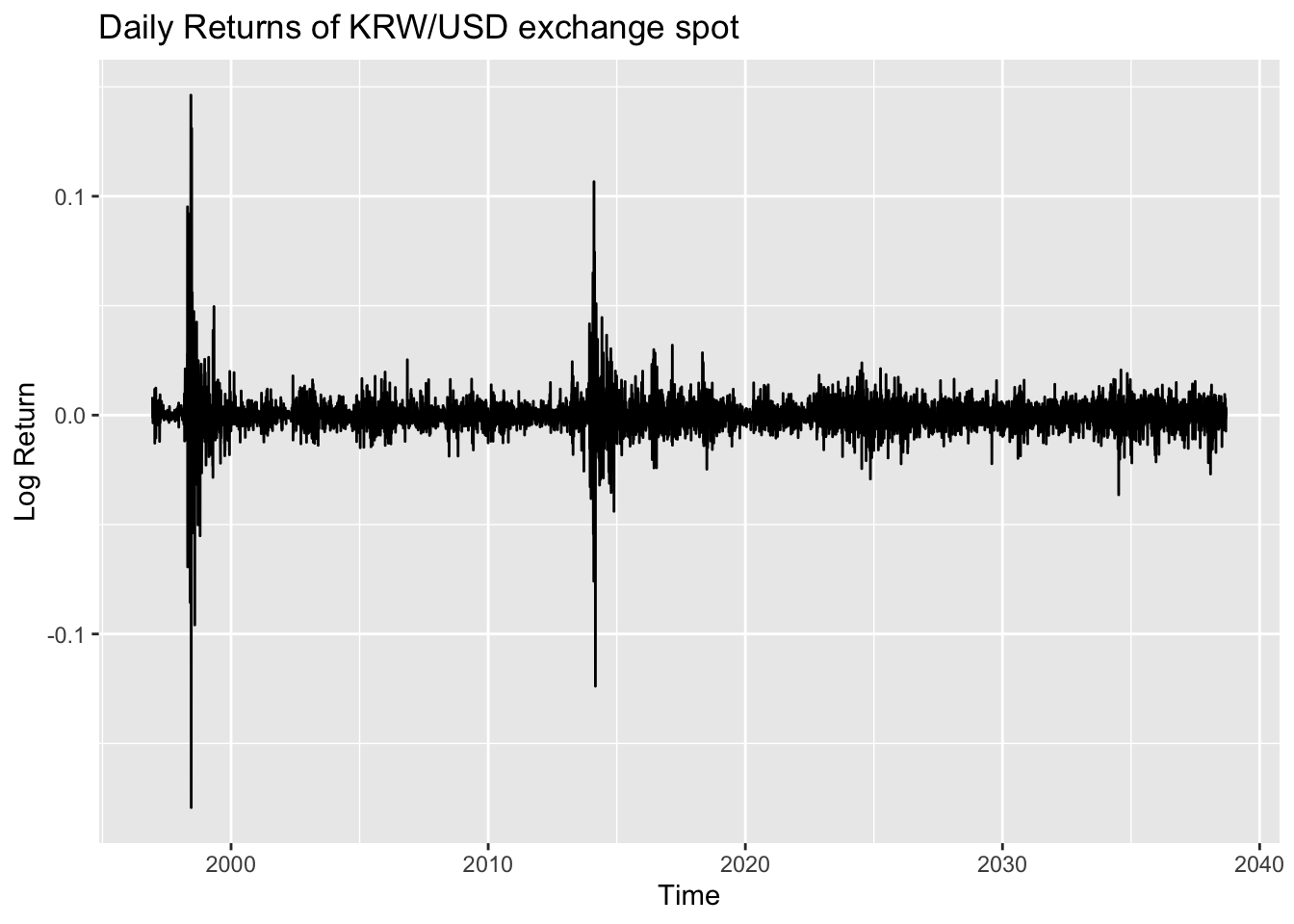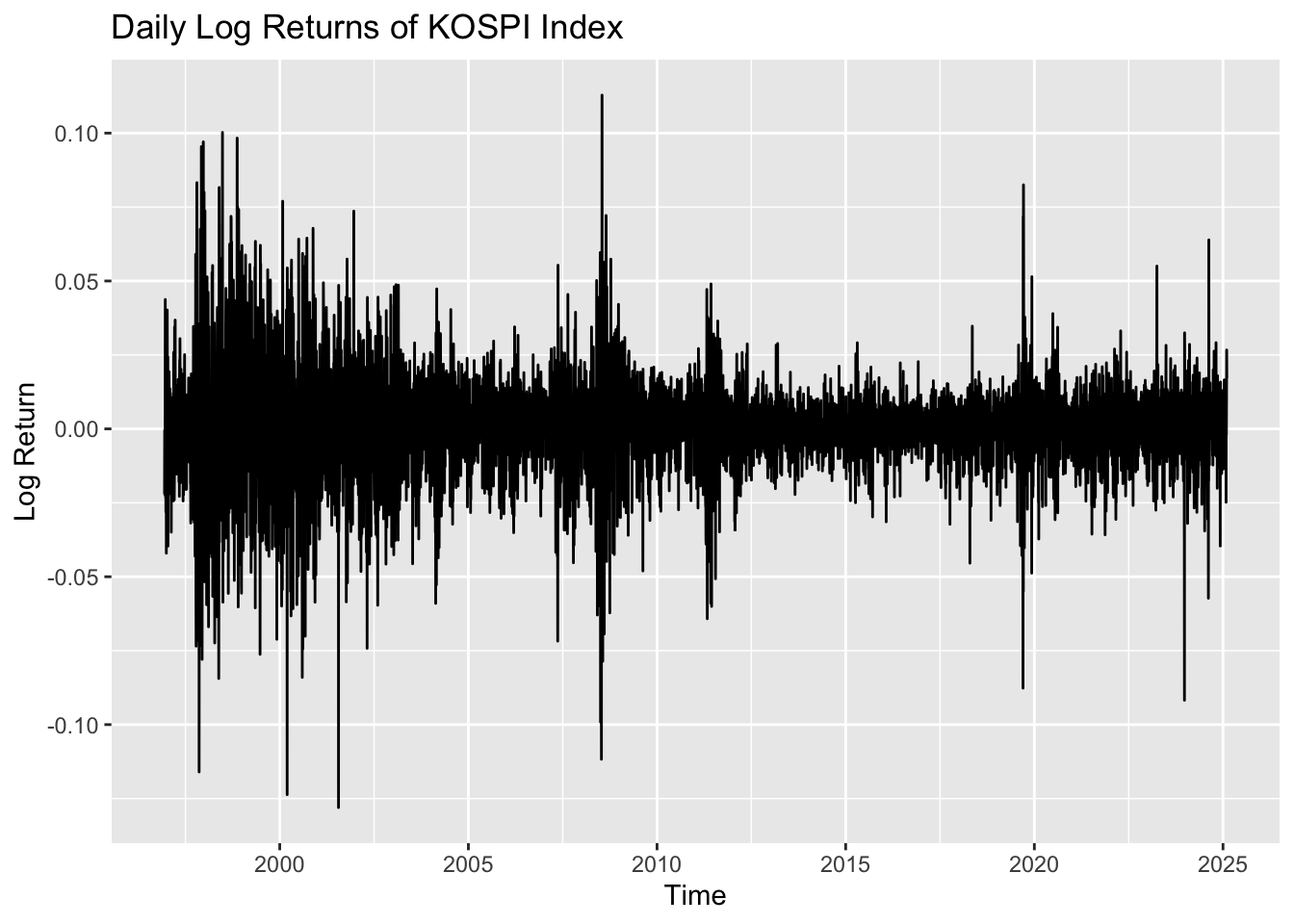The third plot shows the log returns of the KOSPI Index. In this plot, volatility clustering is clearly observed: for most periods, the values are centered near zero, but in certain periods the series exhibits high volatility before returning to calmer behavior. This suggests that the data are potentially appropriate for modeling with the ARCH/GARCH family of models.