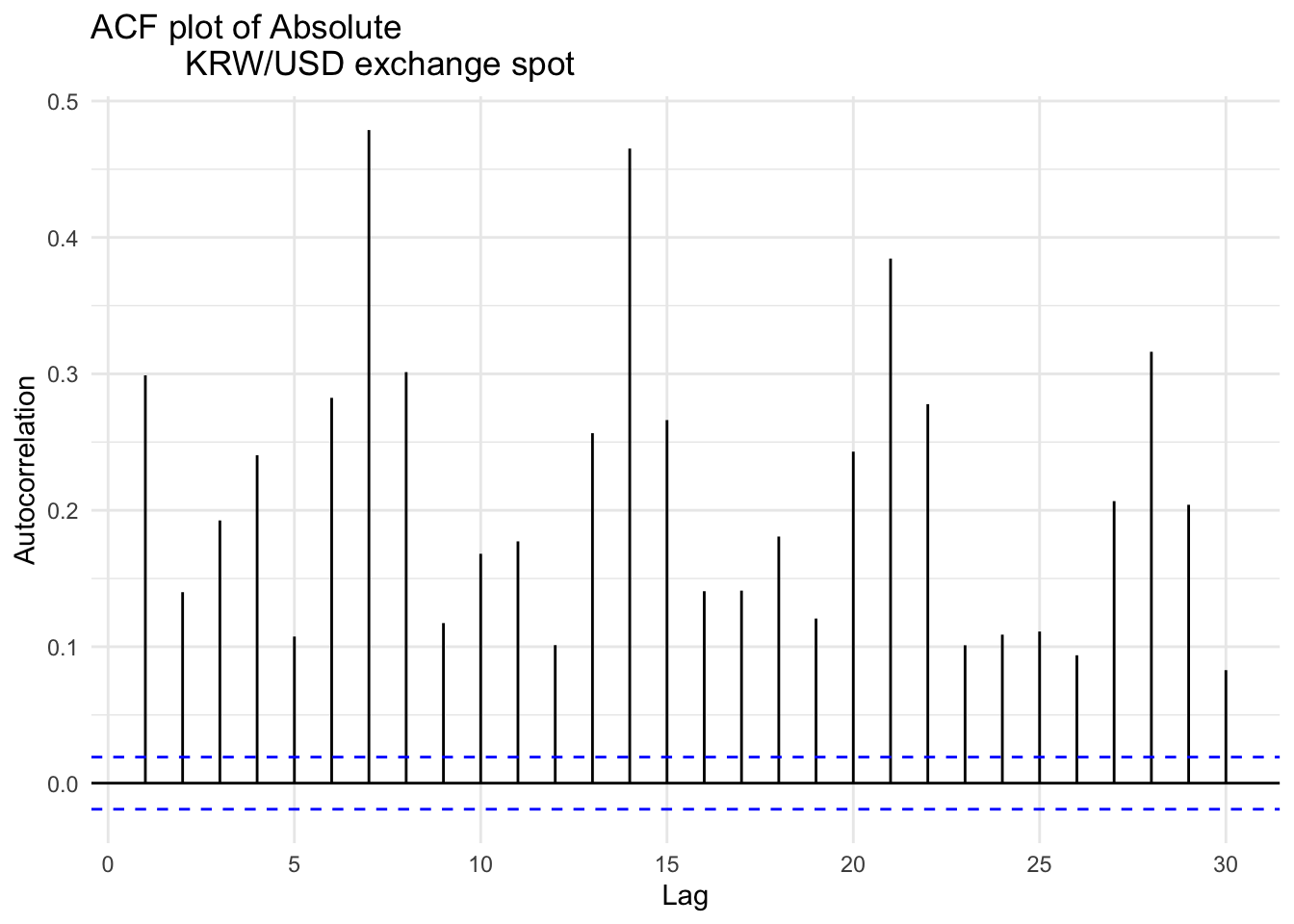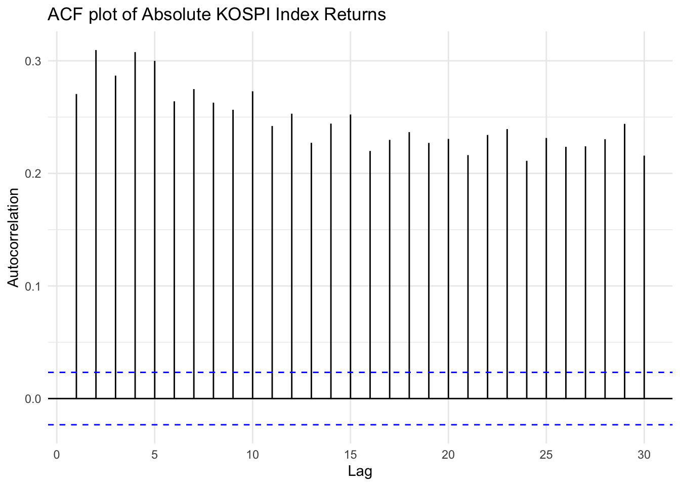 ggAcf(abs(kospi_return), lag.max =30) +ggtitle("ACF plot of Absolute KOSPI Index Returns") +xlab("Lag") +ylab("Autocorrelation") +theme_minimal()