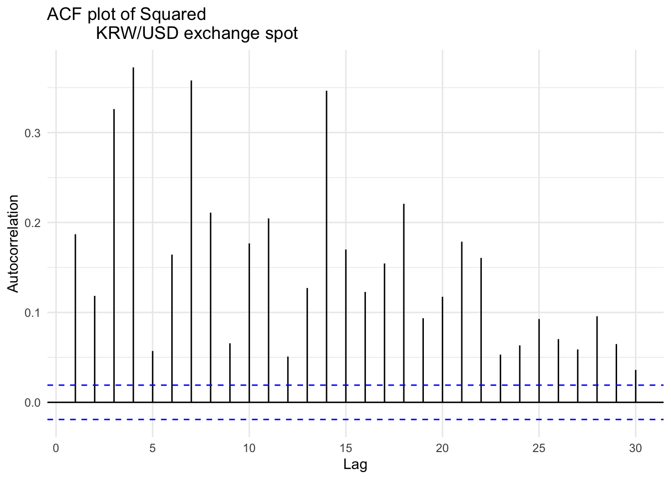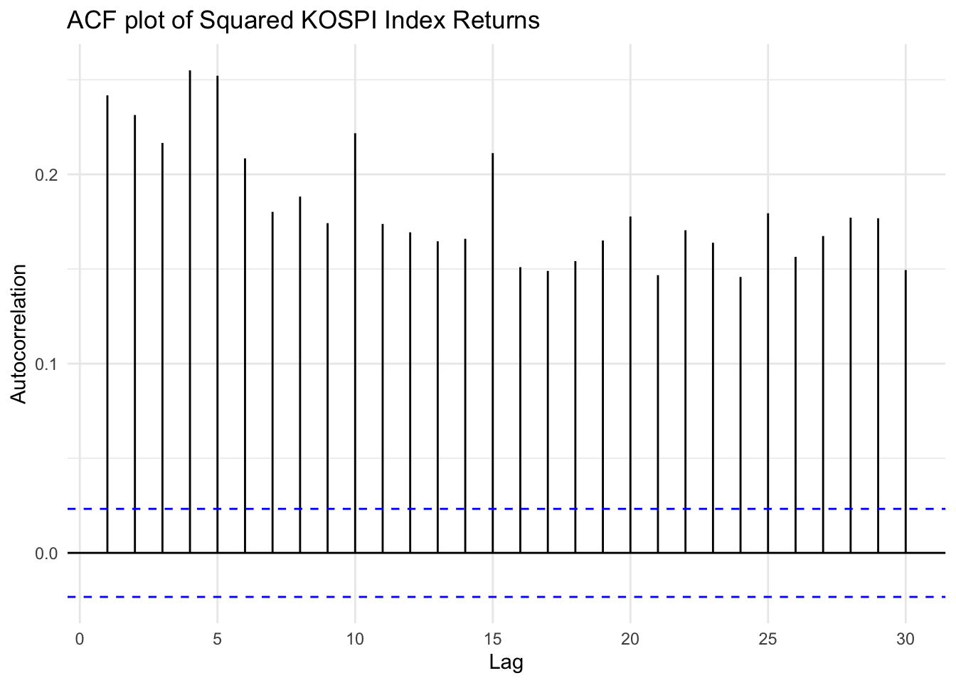 ggAcf(kospi_return^2, lag.max =30) +ggtitle("ACF plot of Squared KOSPI Index Returns") +xlab("Lag") +ylab("Autocorrelation") +theme_minimal()