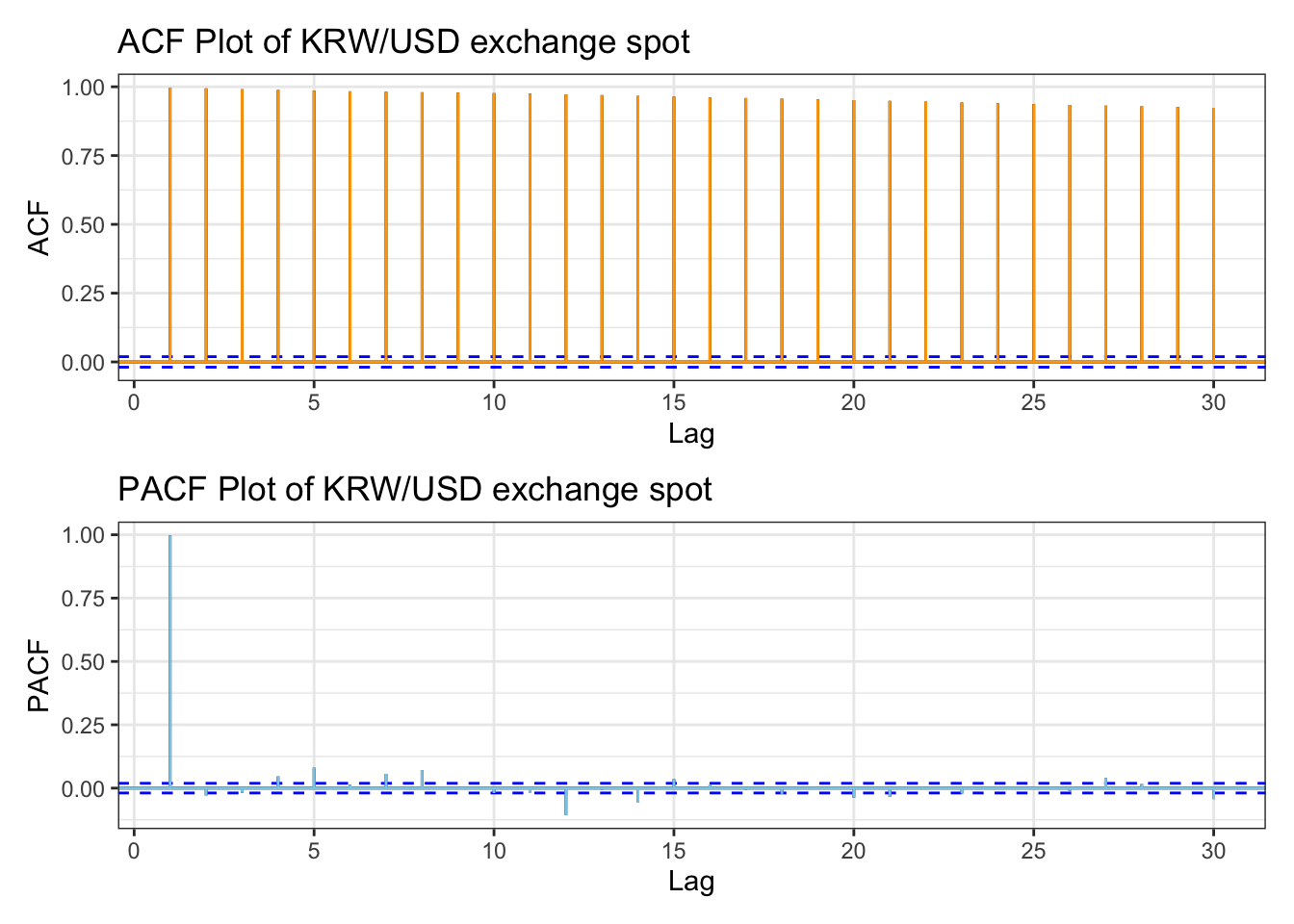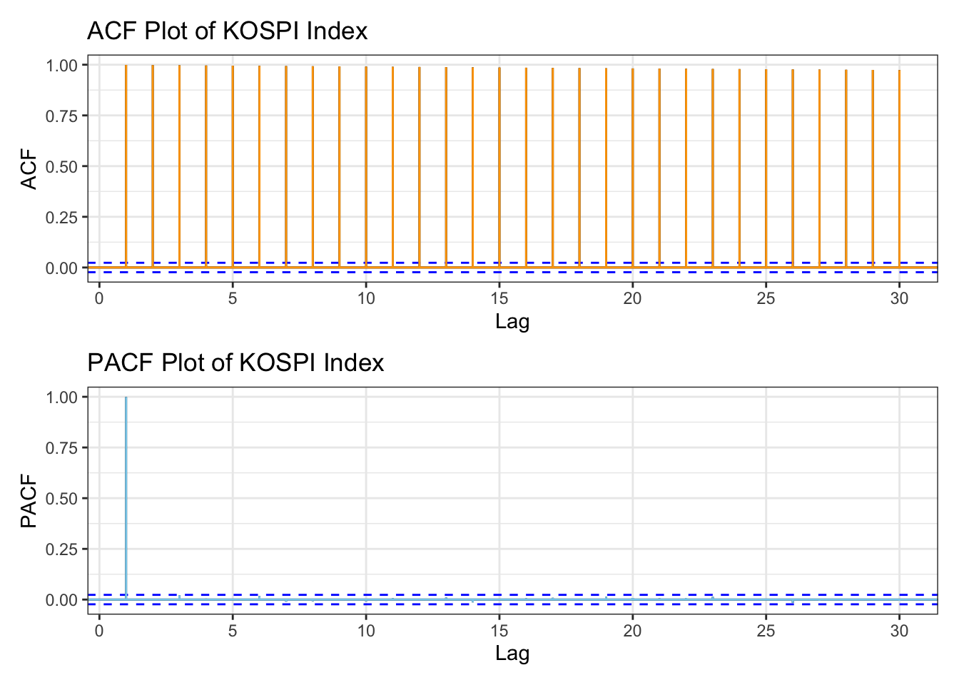 library(patchwork)kospi_acf <-ggAcf(kospi_ts,lag.max =30)+ggtitle("ACF Plot of KOSPI Index") +theme_bw() +geom_segment(lineend ="butt", color ="orange") +geom_hline(yintercept =0, color ="orange") kospi_pacf <-ggPacf(kospi_ts,lag.max =30)+ggtitle("PACF Plot of KOSPI Index") +theme_bw()+geom_segment(lineend ="butt", color ="skyblue") +geom_hline(yintercept =0, color ="skyblue") kospi_acf/kospi_pacf