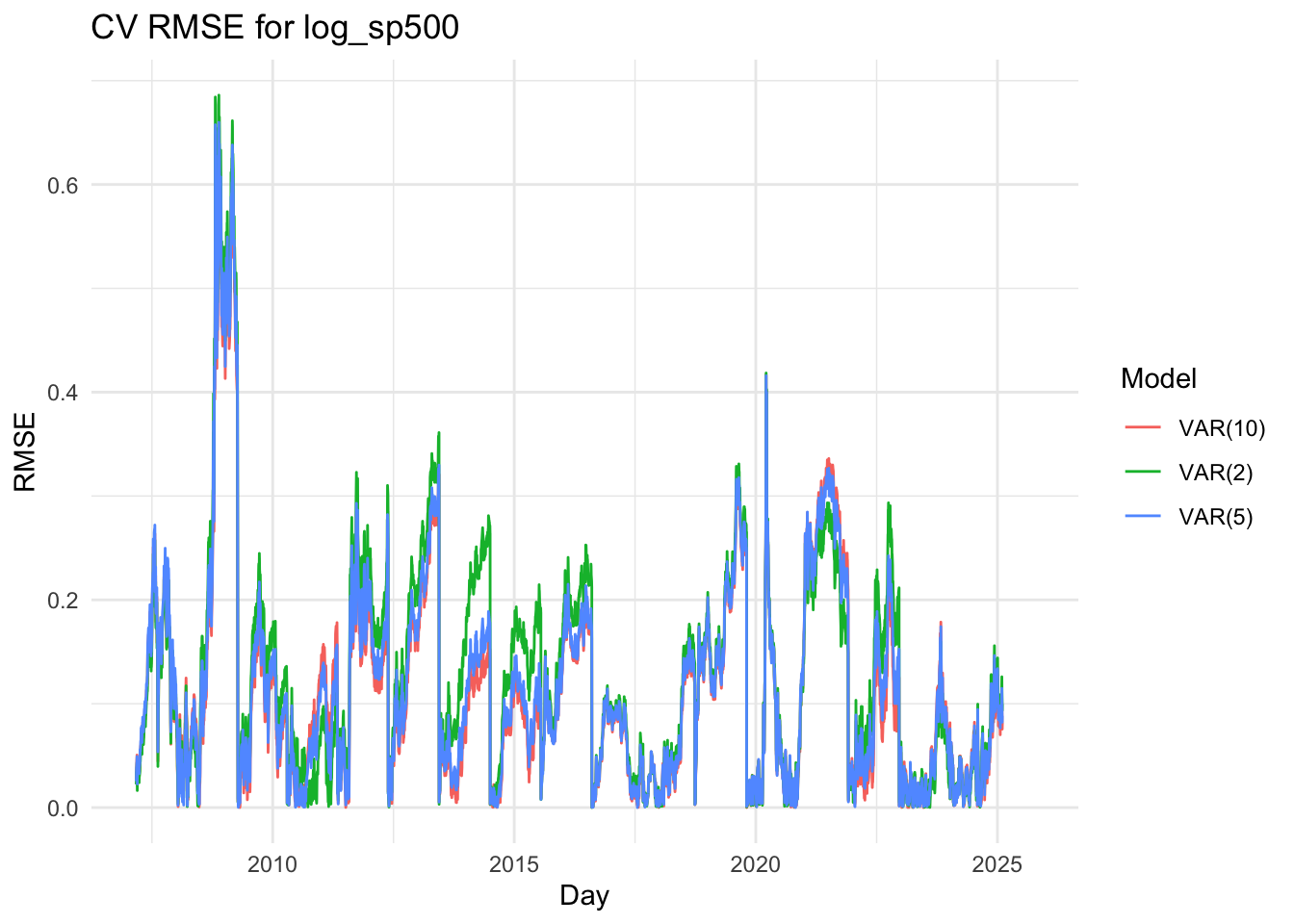 The three line plots above show the RMSE values for three variables, comparing the VAR(2),VAR(5) and var(10) models. Although it’s somewhat difficult to clearly distinguish which model performs better based solely on the plots, the VAR(2) model appears to have slightly lower RMSE values overall. Therefore, I decided to proceed with the VAR(5) model for further analysis.