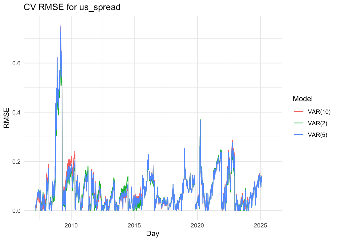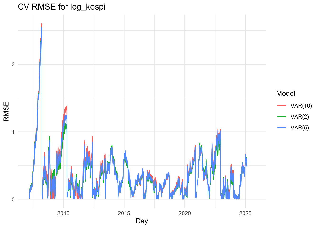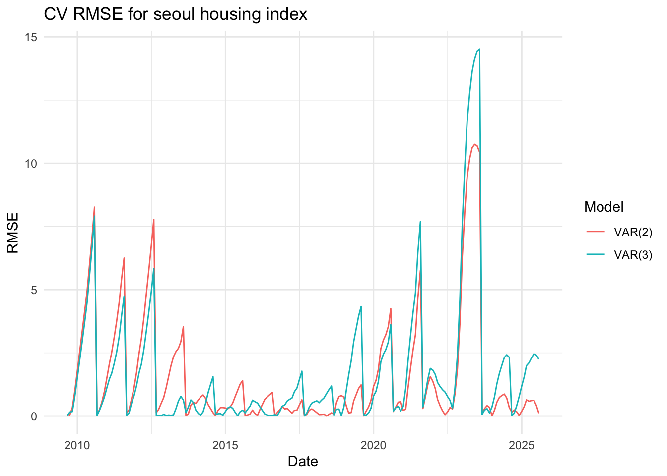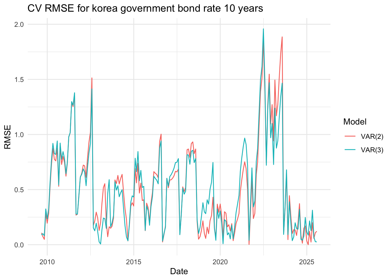 df2$Date <-as.Date(df2$Date)series_names <-c("housing", "KR_10Y", "US_10Y")ts_obj <-ts(df2[, series_names],start =c(year(df2$Date[1]), month(df2$Date[1])),frequency =12)n <-nrow(df2)k<-69h <-12n_k <- n - knum_blocks <-floor(n_k / h)rmse2 <-matrix(NA_real_, n_k, 3) rmse3 <-matrix(NA_real_, n_k, 3) st <-tsp(ts_obj)[1] + (k -1) /12for (i in1:num_blocks) { xtrain <-window(ts_obj, end = st + i -1) xtest <-window(ts_obj,start = st + (i -1) +1/12,end = st + i)if (NROW(xtest) != h) next fit2 <- vars::VAR(xtrain, p =2, type ="both") fcast2 <-predict(fit2, n.ahead = h) ff2 <-cbind( fcast2$fcst$housing[, 1], fcast2$fcst$KR_10Y [, 1], fcast2$fcst$US_10Y [, 1] ) year <- st + (i -1) +1/12 ff2 <-ts(ff2, start =c(year, 1), frequency =12) a <-12* i -11 b <-12* i rmse2[a:b, ] <-sqrt((ff2 - xtest)^2) fit3 <- vars::VAR(xtrain, p =3, type ="both") fcast3 <-predict(fit3, n.ahead = h) ff3 <-cbind( fcast3$fcst$housing[, 1], fcast3$fcst$KR_10Y [, 1], fcast3$fcst$US_10Y [, 1] ) ff3 <-ts(ff3, start =c(year, 1), frequency =12) rmse3[a:b, ] <-sqrt((ff3 - xtest)^2)}colnames(rmse2) <- series_namescolnames(rmse3) <- series_namesmonth_index <-1:n_kdates1 <-as.Date(df2$Date[(k +1):n])if (length(dates1) < n_k) { dates1 <-c(dates1, rep(as.Date(NA), n_k -length(dates1)))} elseif (length(dates1) > n_k) { dates1 <- dates1[1:n_k]}rmse2_df <-data.frame(month_index, dates1, rmse2, row.names =NULL)names(rmse2_df) <-c("Month","Date", series_names)rmse2_df$Model <-"VAR(2)"rmse3_df <-data.frame(month_index, dates1, rmse3, row.names =NULL)names(rmse3_df) <-c("Month","Date", series_names)rmse3_df$Model <-"VAR(3)"rmse_combined <-rbind(rmse2_df, rmse3_df)