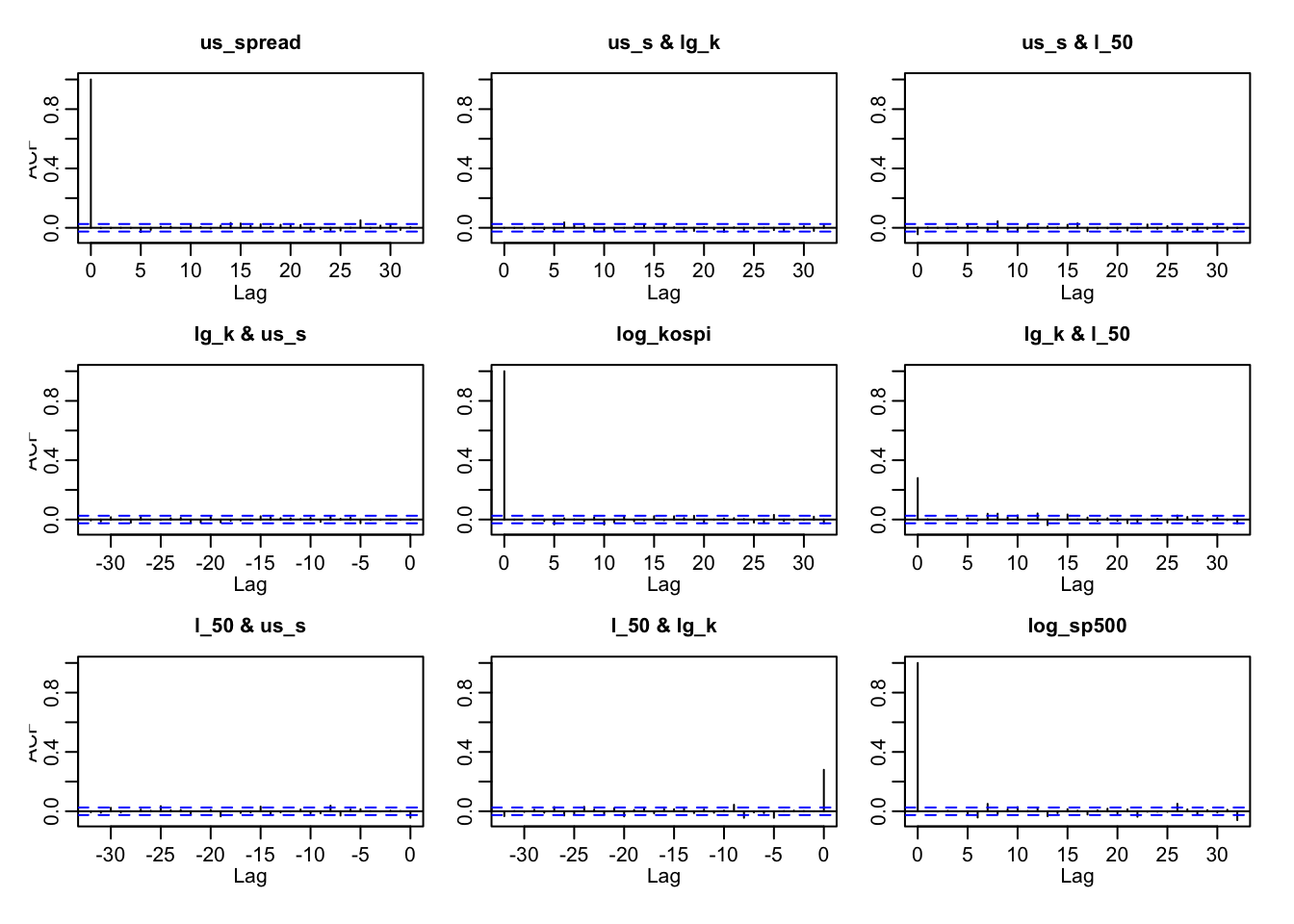 fin_short_fit <-auto.arima(xreg1[, "US_KR_3Y"])fshort <-forecast(fin_short_fit, h =32) fin_long_fit <-auto.arima(xreg1[, "US_KR_10Y"])flong <-forecast(fin_long_fit, h =32)usd_fit <-auto.arima(xreg1[, "log_usd_index"])fusd <-forecast(usd_fit, h =32)sp_fit <-auto.arima(xreg1[, "log_sp500_close"])fsp <-forecast(sp_fit, h =32)fxreg1 <-cbind(US_KR_3Y = fshort$mean,US_KR_10Y = flong$mean,log_usd_index = fusd$mean,log_sp500_close = fsp$mean)