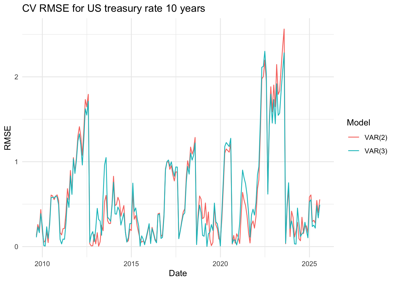 ggplot(data = rmse_combined, aes(x = Date, y = US_10Y, color = Model)) +geom_line() +labs(title ="CV RMSE for US treasury rate 10 years",x ="Date",y ="RMSE",color ="Model" ) +theme_minimal()