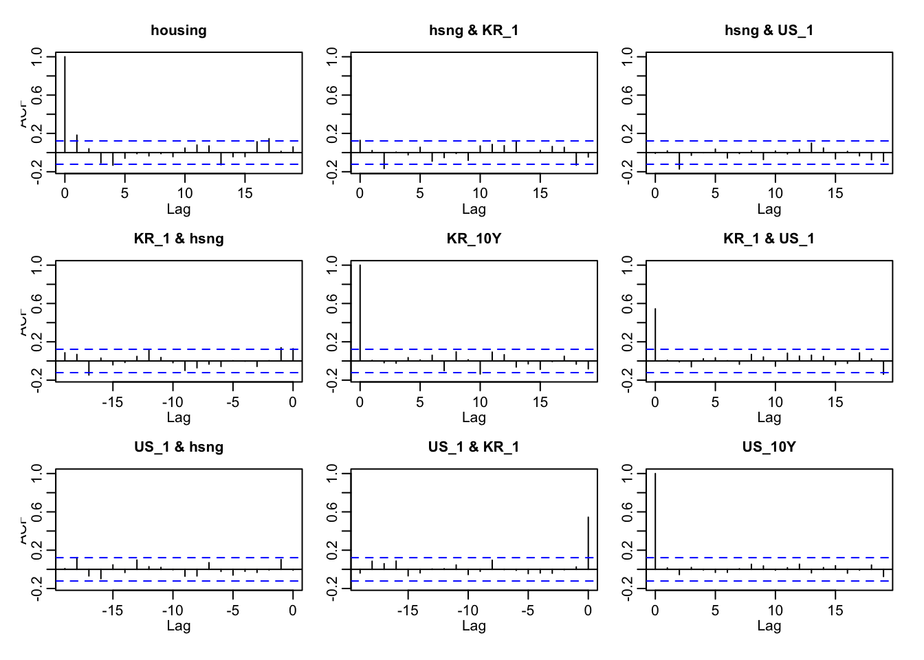 In the VAR(2) model, the housing variable is primarily driven by its own past values, with highly significant coefficients for its first and second lags (positive and negative, respectively), implying mean-reverting dynamics. Korean and U.S. long-term interest rates (KR_10Y and US_10Y) have only weak short-run effects on housing, as most of their coefficients are statistically insignificant. The KR_10Y equation shows strong persistence—its own first and second lags are significant and positive—and a significant influence from the U.S. 10-year yield, suggesting cross-country linkages in bond markets. The U.S. yield (US_10Y) equation confirms high persistence as well, with its first lag strongly significant, while the trend term is also positive and significant, indicating a gradual upward drift. Residual correlations show moderate co-movement between KR_10Y and US_10Y (ρ ≈ 0.54) but only weak links between interest rates and housing.