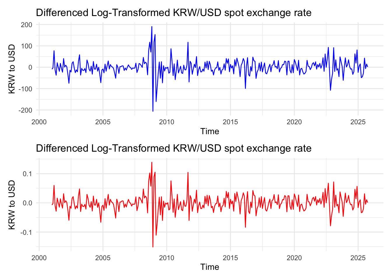 diff_krw <-diff(ts_krw)diff_log_krw <-diff(ts_log_krw)p1 <-ggplot() +geom_line(aes(x =time(diff_krw), y = diff_krw), color ="blue") +labs(title ="Differenced Log-Transformed KRW/USD spot exchange rate",x ="Time",y ="KRW to USD") +theme_minimal()p2 <-ggplot() +geom_line(aes(x =time(diff_log_krw), y = diff_log_krw), color ="red") +labs(title ="Differenced Log-Transformed KRW/USD spot exchange rate",x ="Time",y ="KRW to USD") +theme_minimal()p1 / p2