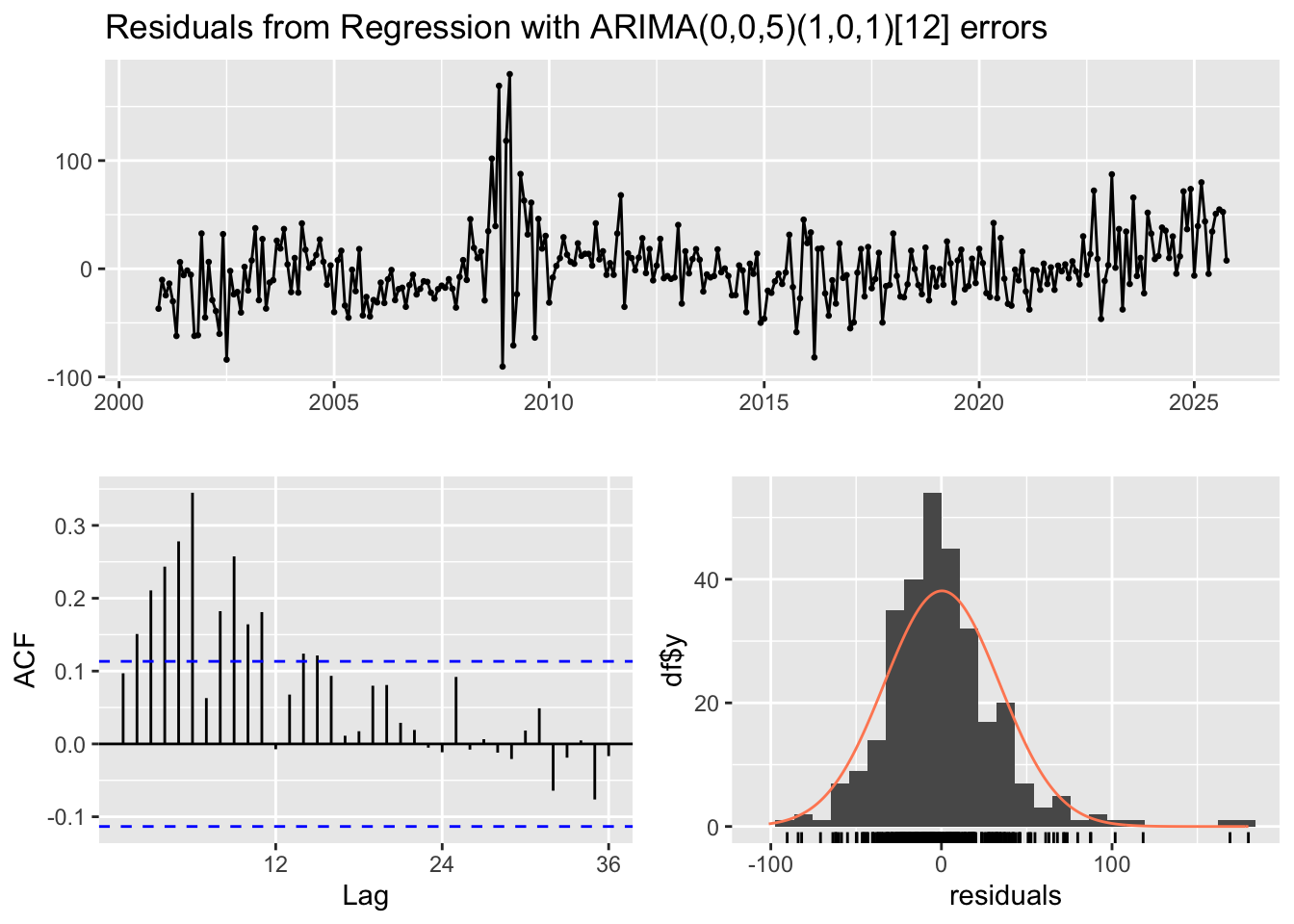 The auto.arima model exhibits noticeable autocorrelation, with a significant spike in the ACF before lag 12, suggesting the presence of remaining short-term dependence that the model has not fully captured. Additionally, the residual series displays visible fluctuations, including a pronounced period of volatility between 2008 and 2010, indicating potential structural changes or outliers during that time. These patterns imply that the model may be under-differenced or missing key components to adequately capture the temporal dynamics and seasonal structure of the data.