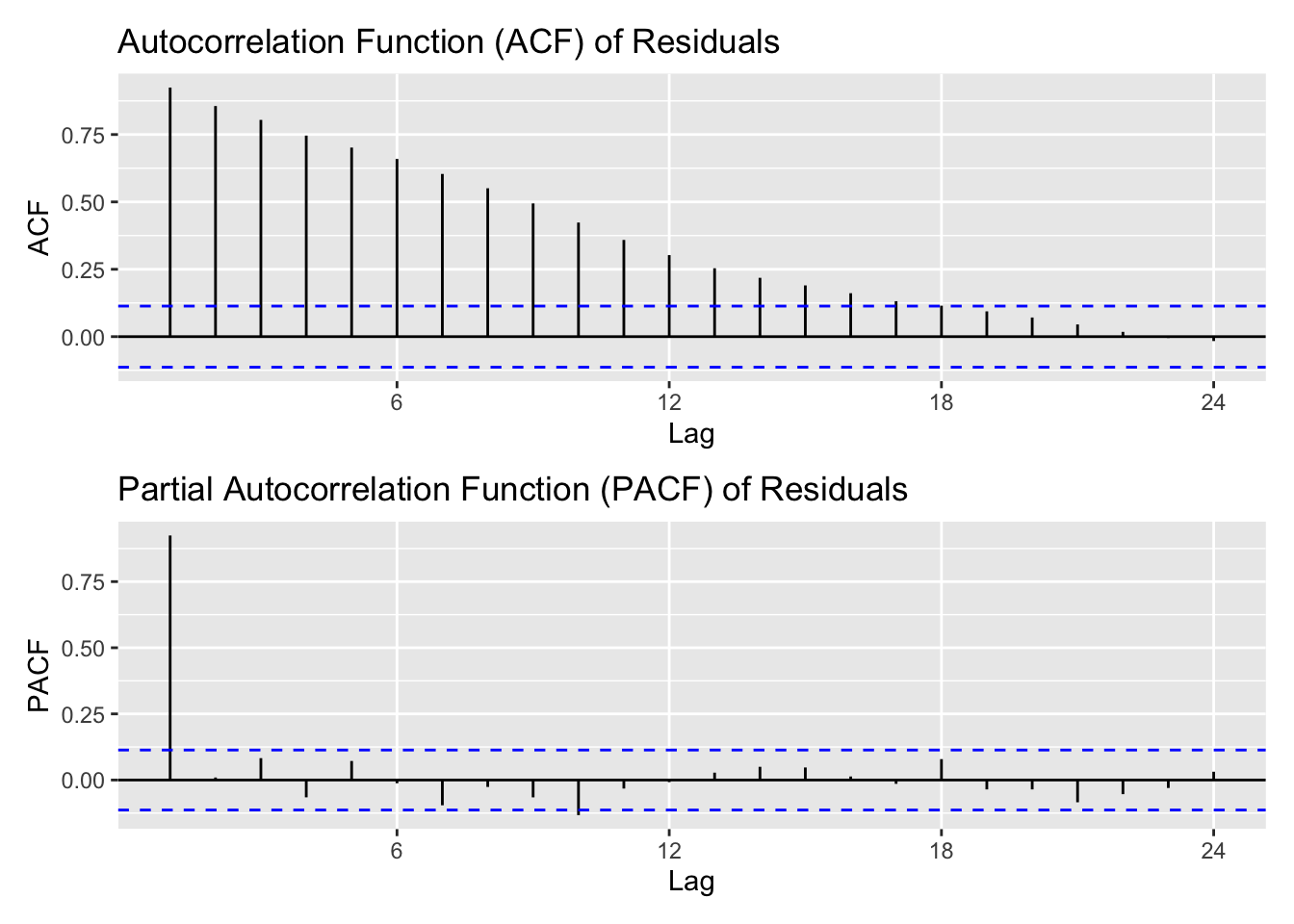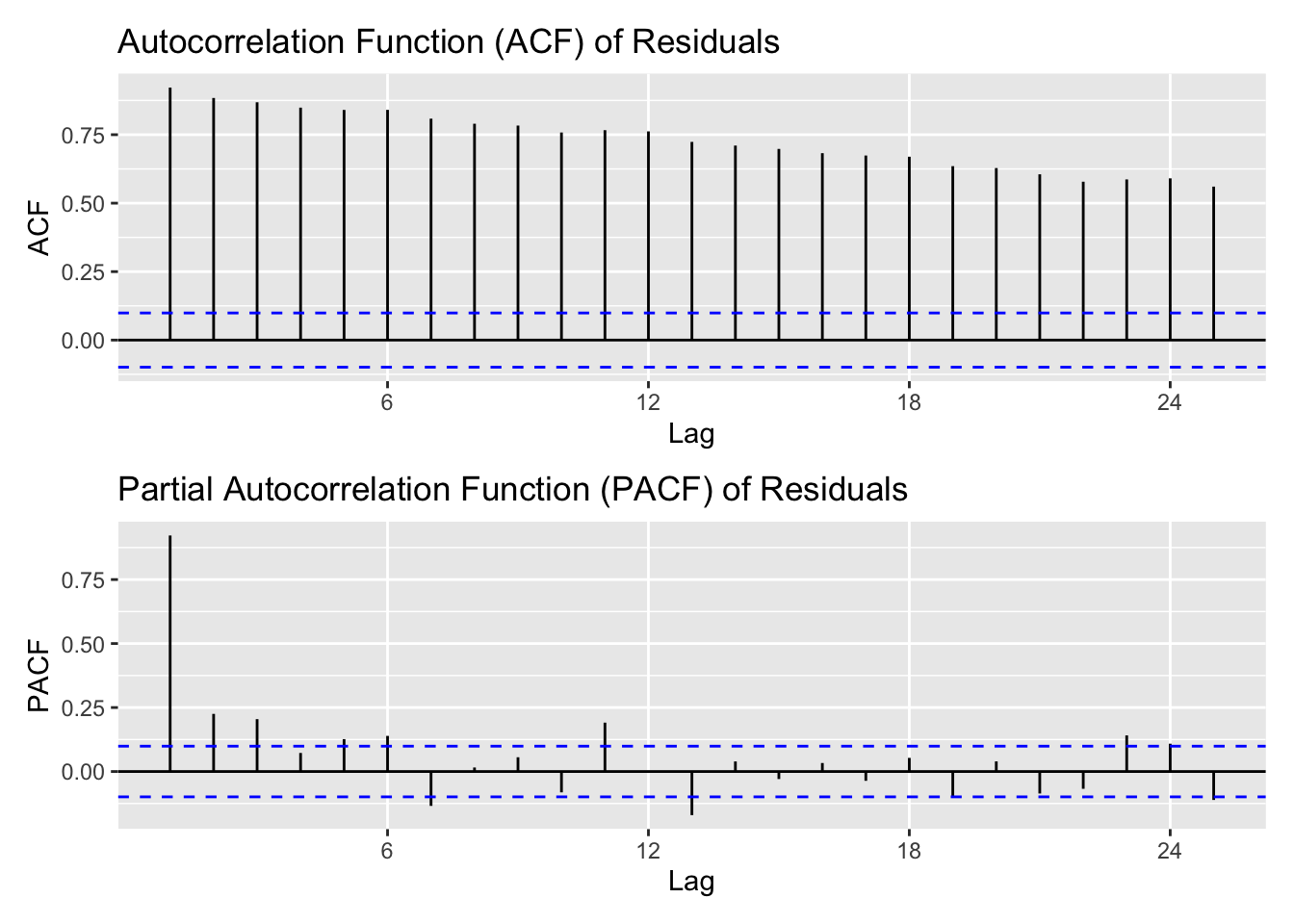 library(patchwork)res.fit2<-ts(residuals(m2),start =c(1993,1),frequency =12)acf2<-ggAcf(res.fit2) +ggtitle("Autocorrelation Function (ACF) of Residuals")pacf2<-ggPacf(res.fit2) +ggtitle("Partial Autocorrelation Function (PACF) of Residuals")acf2 / pacf2