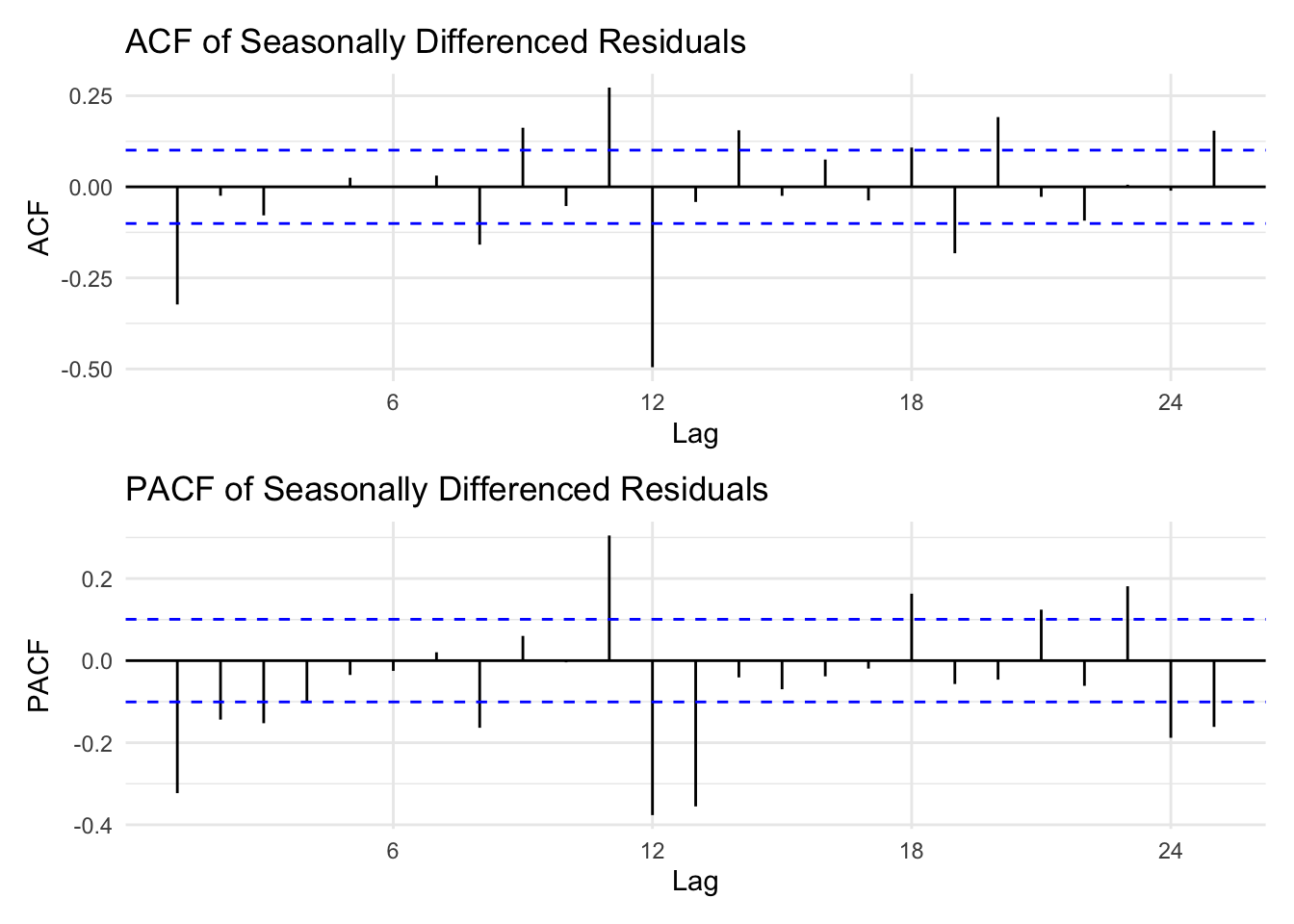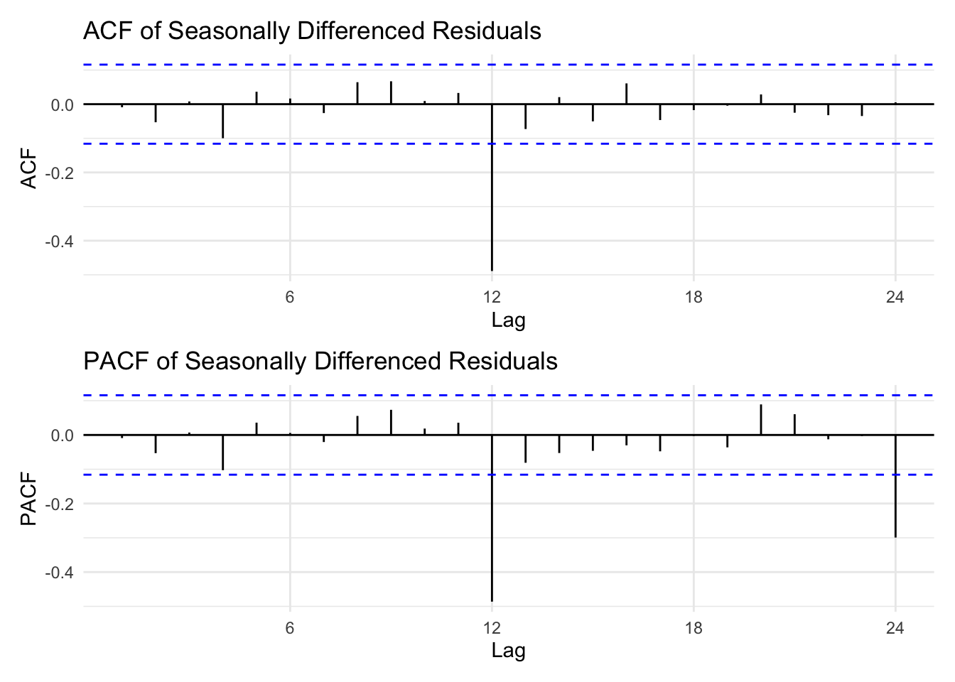 diff2<-diff(res.fit2)seasonal_diff2<-diff(diff2,lag =12)diff_p3 <-ggAcf(seasonal_diff2) +ggtitle("ACF of Seasonally Differenced Residuals") +theme_minimal()diff_p4 <-ggPacf(seasonal_diff2) +ggtitle("PACF of Seasonally Differenced Residuals") +theme_minimal()diff_p3 /diff_p4