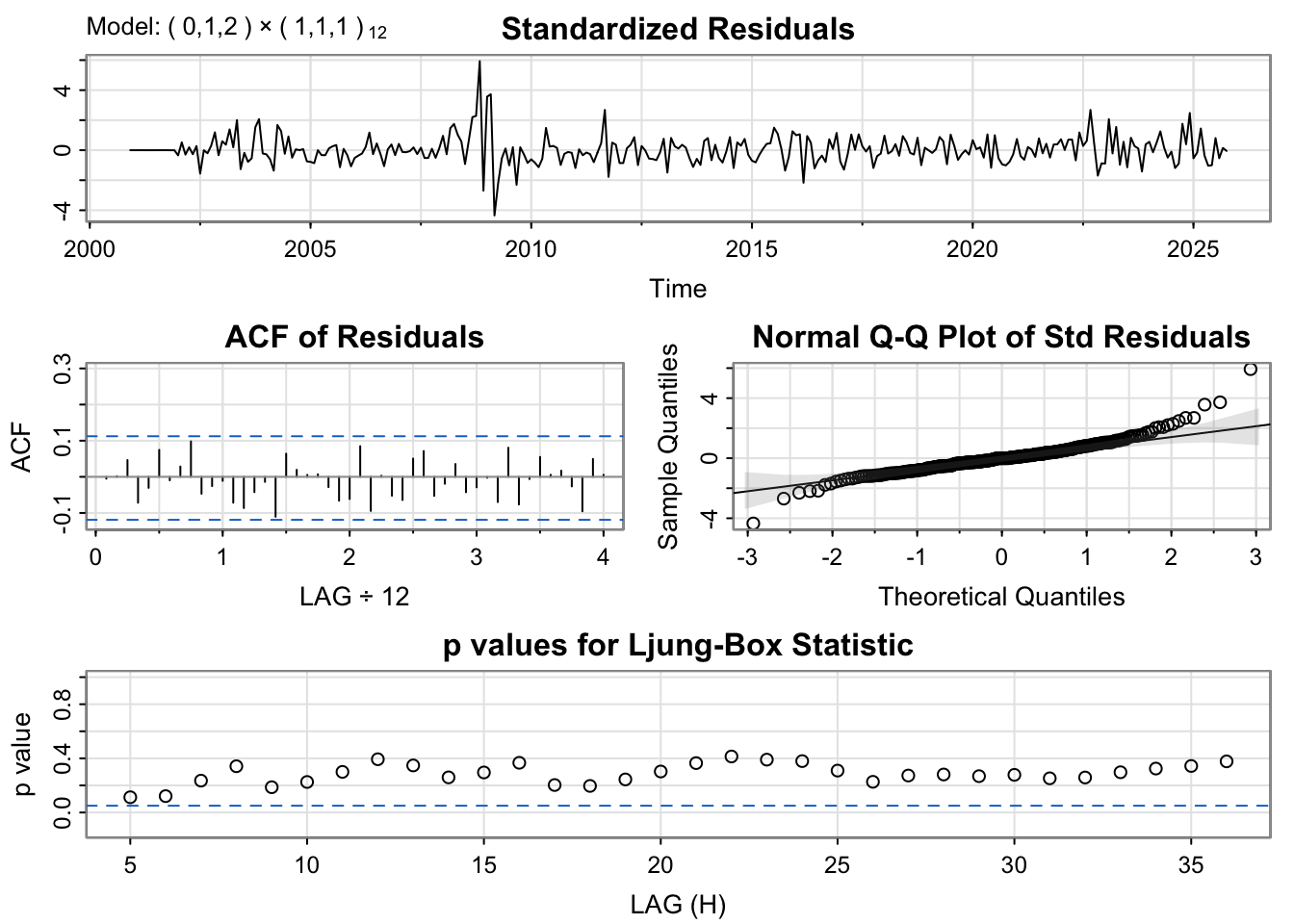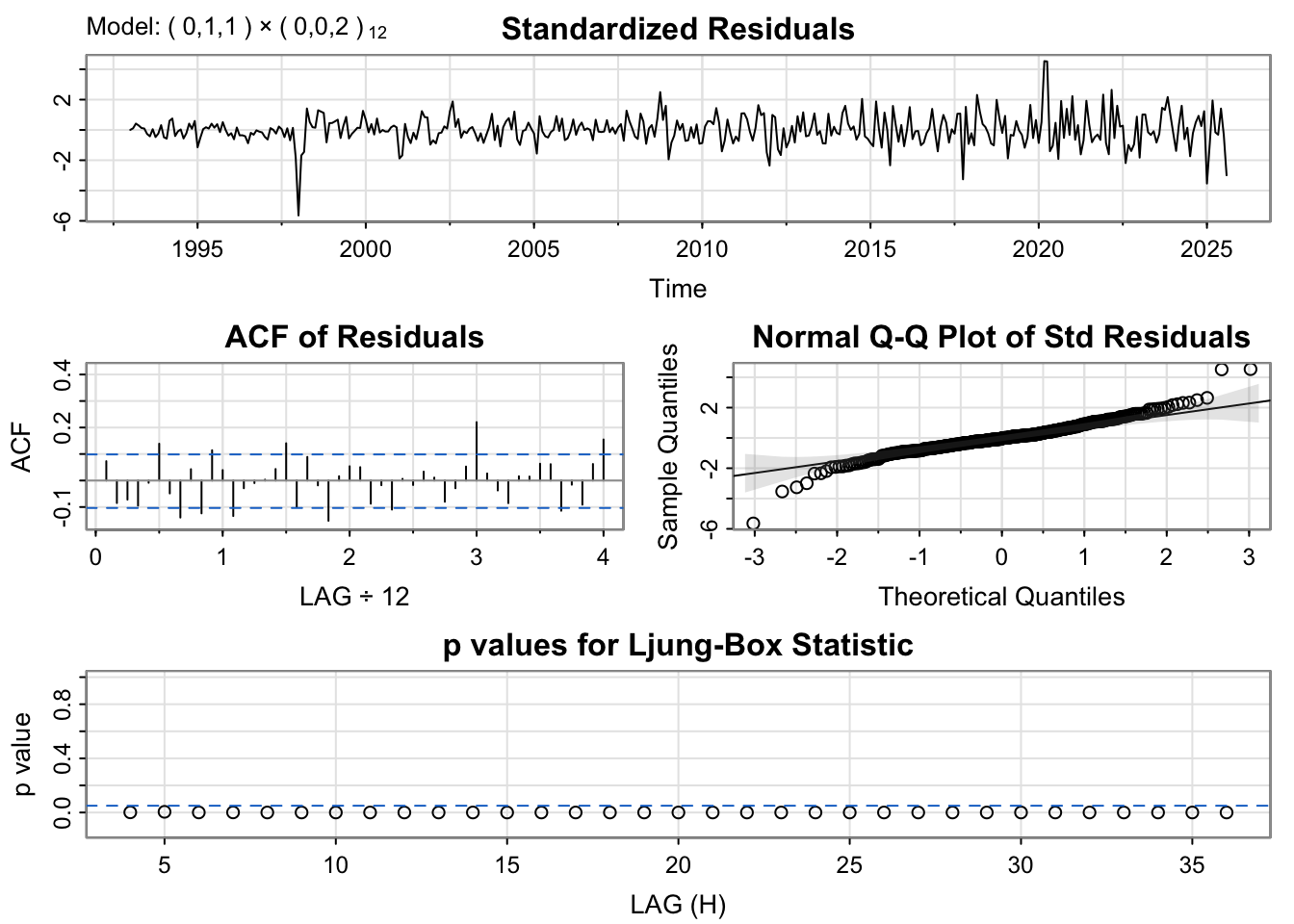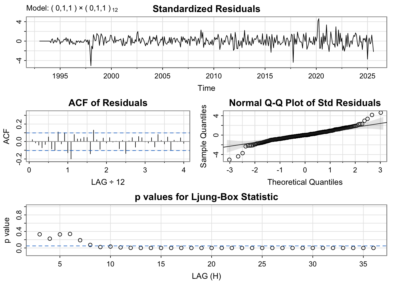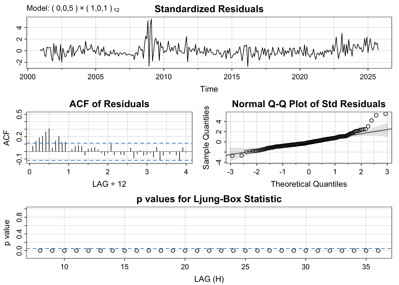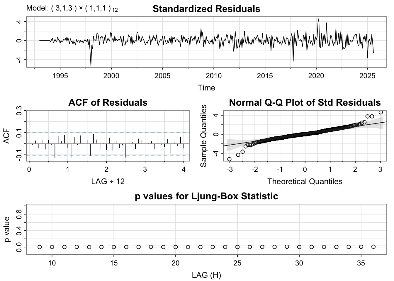 All three models display similar residual patterns, characterized by random fluctuations around zero with a few noticeable outlier spikes. The ACF plots of the residuals also show comparable behavior across models; however, the ARIMA(3,1,3)(1,1,1)[12] model performs slightly better, as its autocorrelations remain within the significance bounds across most lags. The normal Q–Q plots indicate that all models exhibit similar residual distributions, with deviations at the tails suggesting the presence of non-normality often observed in time series data. Although the Ljung–Box test results indicate that none of the models fully satisfy the white noise assumption—since most p-values fall below the significance threshold—the ARIMA(0,1,1)(0,1,1)[12] model appears to offer a marginally better fit compared to the others.