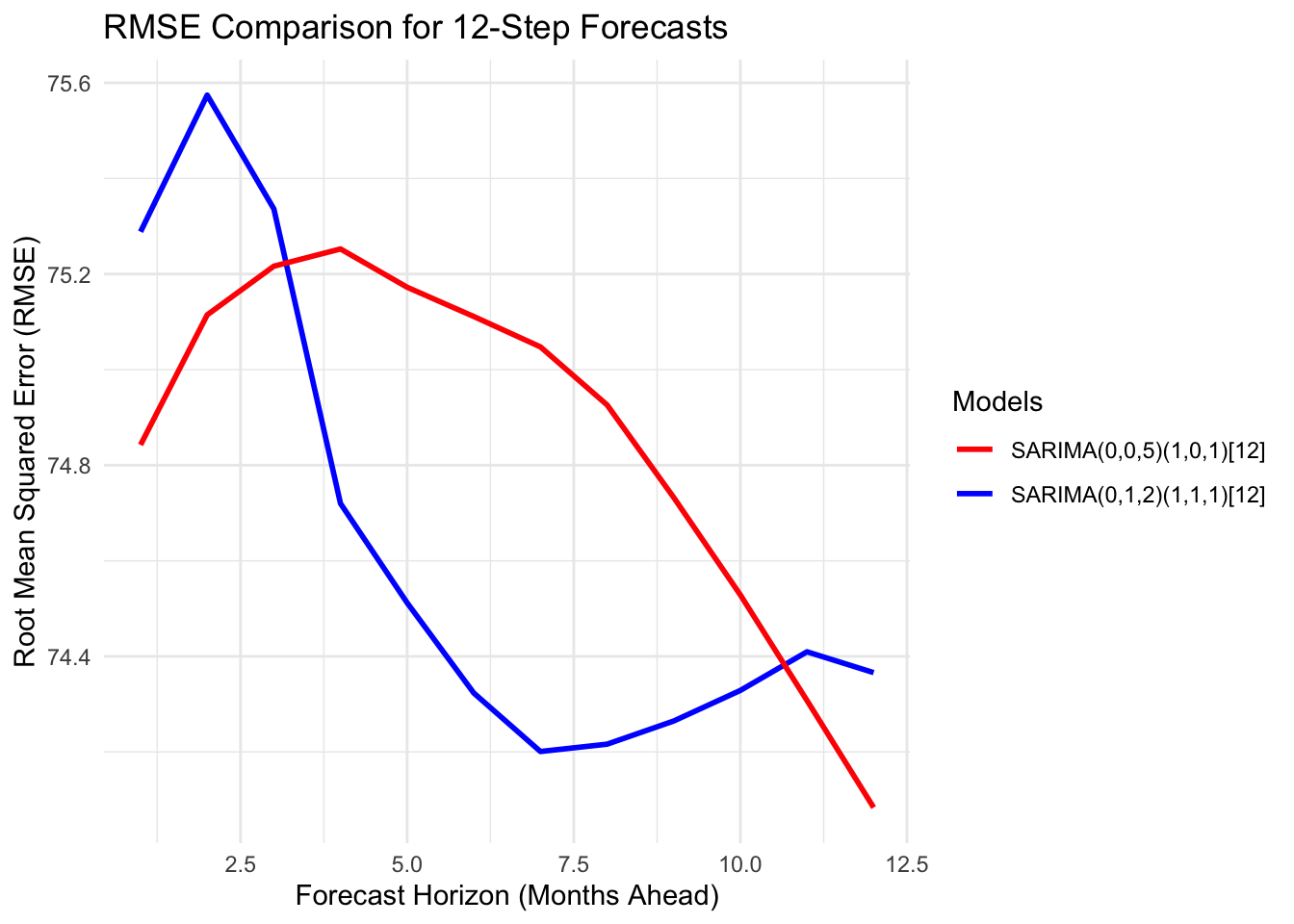 ggplot(rmse_table1, aes(x = Horizon1)) +geom_line(aes(y = RMSE_Model1, color ="SARIMA(0,1,2)(1,1,1)[12]"), size =1) +geom_line(aes(y = RMSE_Model2, color ="SARIMA(0,0,5)(1,0,1)[12]"), size =1) +labs(title ="RMSE Comparison for 12-Step Forecasts",x ="Forecast Horizon (Months Ahead)",y ="Root Mean Squared Error (RMSE)") +scale_color_manual(name ="Models", values =c("red", "blue")) +theme_minimal()