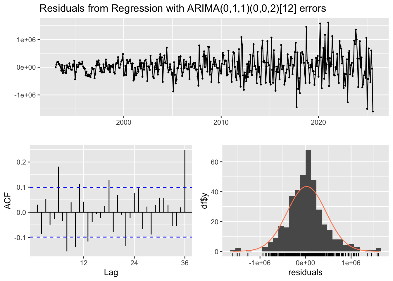 The ARIMA(0,1,1)(0,0,2)[12] model from auto.arima() yields residuals that fluctuate randomly around zero, though variability increases in recent years, indicating the fit is not perfect. The residual ACF shows only mild autocorrelation, with most lags within the 95% bounds, but a faint seasonal signal remains near lag 12. The residual histogram is approximately normal, with slight skewness driven by a few large observations.