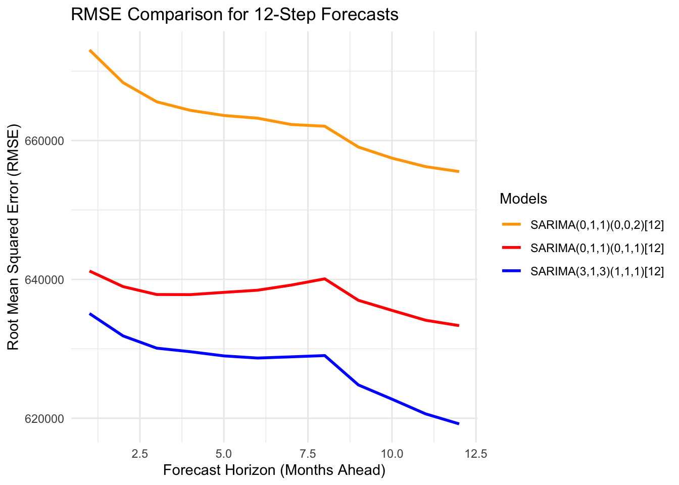 ggplot(rmse_table1, aes(x = Horizon1)) +geom_line(aes(y = RMSE_Model1, color ="SARIMA(3,1,3)(1,1,1)[12]"), size =1) +geom_line(aes(y = RMSE_Model2, color ="SARIMA(0,1,1)(0,1,1)[12]"), size =1) +geom_line(aes(y = RMSE_Model3, color ="SARIMA(0,1,1)(0,0,2)[12]"), size =1) +labs(title ="RMSE Comparison for 12-Step Forecasts",x ="Forecast Horizon (Months Ahead)",y ="Root Mean Squared Error (RMSE)") +scale_color_manual(name ="Models", values =c("orange","red", "blue")) +theme_minimal()